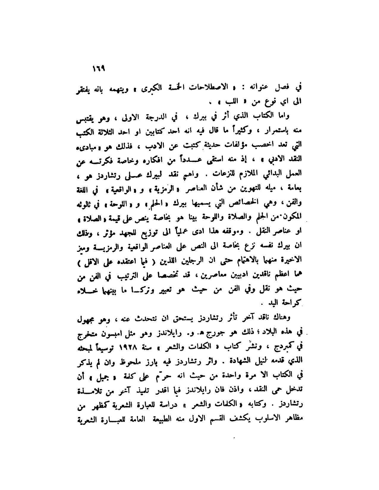 وهناك ناقد آخر تأثر رتشاردز يستحق أن نتحدث عنه، وهو مجهول في هذه البلاد؛ ذلك هو جورج هـ. و. رايلاندز وهو مثل إمبسون متخرج في كمبردج، ونشر كتاب " الكلمات والشعر " سنة 1928 توسيعاً لمبحثه الذي قدمه لنيل الشهادة. واثر رتشاردز فيه بارز ملحوظ وان لم يذكر في الكتاب إلا مرة واحدة من حيث انه حرم على كلمة " جميل " أن تدخل حمى النقد، وأذن فأن رايلاندز فيما اقدر تلميذ آخر من تلامذة رتشاردز. وكتابه " الكلمات والشعر " دراسة للعبارة الشعرية كمظهر من مظاهر الأسلوب يكشف القسم الأول منه الطبيعة العامة للعبارة الشعرية