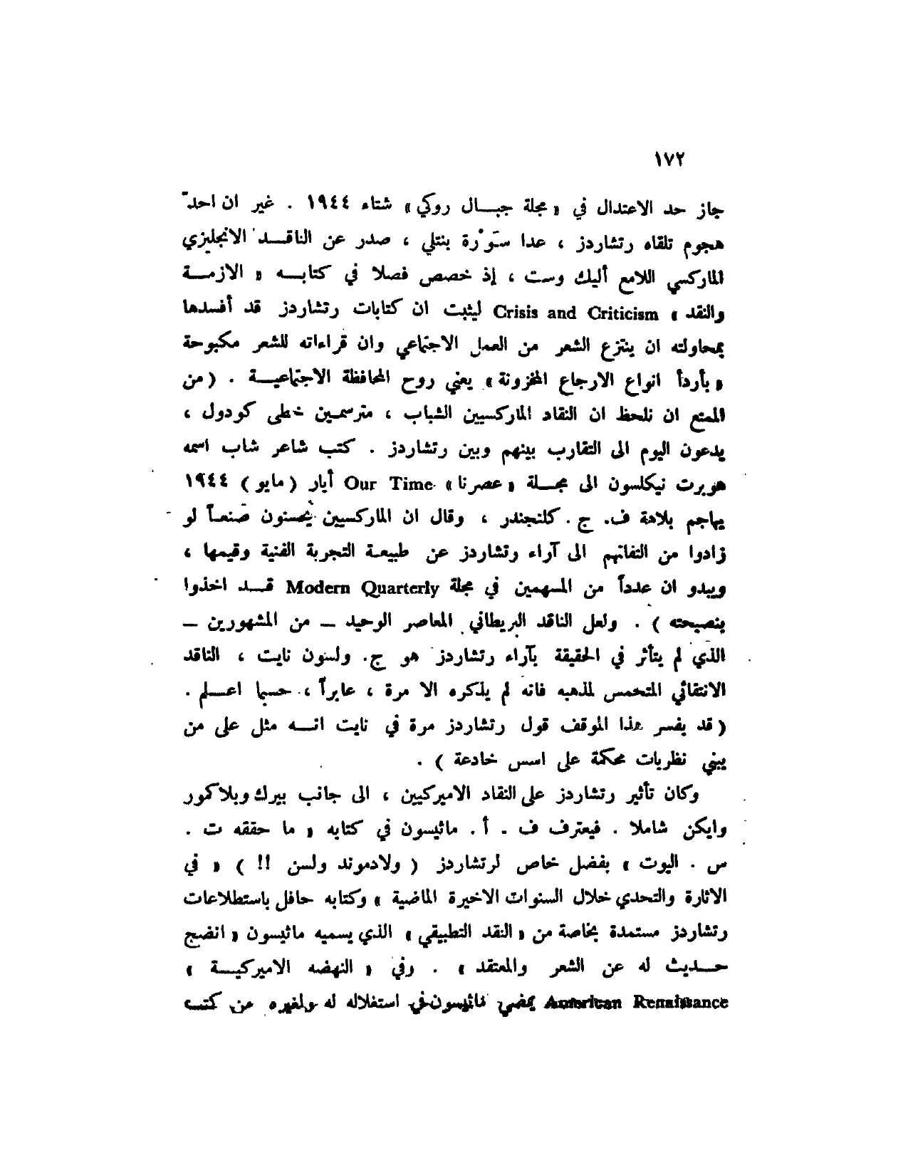 جاز حد الاعتدال في " مجلة جبال روكي " شتاء 1944. غير أن أحد هجوم تلقاه رتشاردز، عدا سورة بنتلي، صدر عن الناقد الإنجليزي الماركسي اللامع إليك وست، إذ خصص فصلاً في كتابه " الأزمة والنقد " Crisis and Criticism ليثبت أن كتابات رتشاردز قد أفسدها بمحاولته أن ينتزع الشعر من العمل الاجتماعي وان قراءاته للشعر مكبوحة " بأردأ أنواع الإرجاع المخزونة " يعني روح المحافظة الاجتماعية. (من الممتع ان نلحظ أن النقاد الماركسيين الشياي، مترسمين خطى كودول، يدعون اليوم إلى التقارب بينهم وبين رتشاردز. كتب شاعر شاب اسمه هوبرت نيكلسون إلى مجلة " عصرنا " Our Time أيار (مايو) 1944 يهاجم بلاهة ف. ج. كلينجدر، وقال ان الماركسيين يحسنون صنعاً لو زادوا من التفاتهم إلى آراء رتشاردز عن طبيعة التجربة الفنية وقيمها، ويبدو أن عدداً من المسهمين في مجلة Modern Quarterly قد اخذوا بنصيحته) . ولعل الناقد البريطاني المعاصر الوحيد - من المشهورين - الذي لم يتأثر في الحقيقة بآراء رتشاردز هو ج. ولسون نايت، الناقد الانتقائي المتحمس لمذهبه فانه لم يذكره إلا مرة، عابراً، حسبما أعلم. (قد يفسر هذا الموقف قول رتشاردز مرة في نايت أنه مثل على من يبني نظريات محكمة على أسس خادعة) .