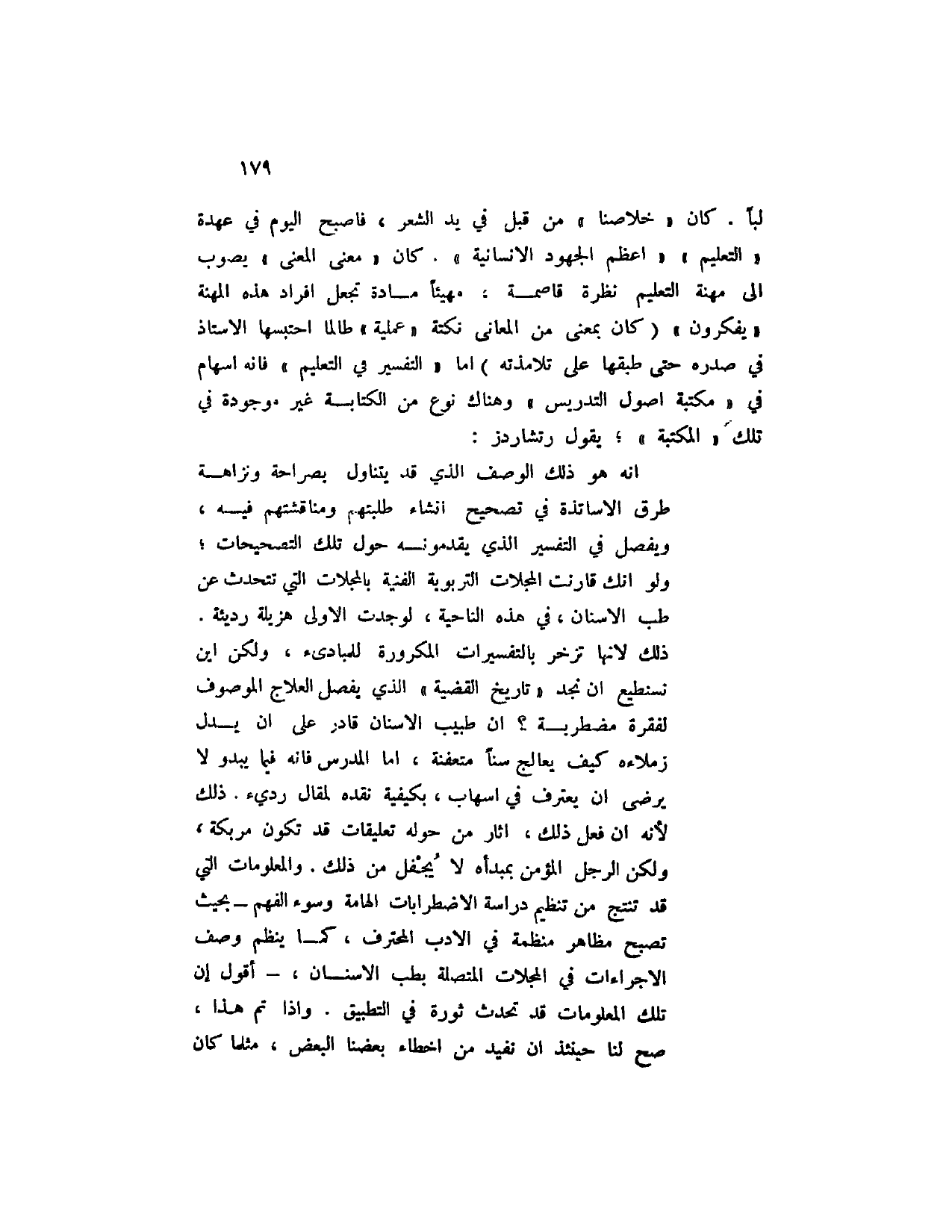 لباً. كان " خلاصنا " من قبل في يد الشعر، فاصبح اليوم في عهدة " التعليم " " اعظم الجهود الإنسانية ". كان " معنى المعنى " يصوب إلى مهنة التعليم نظرة قاصمة، مهيئاً مادة تجعل افراد هذه المهنة " يفكرون " (كان بمعنى من المعاني نكتة " عملية " طالما أحتبسها الأستاذ في صدره حتى طبقها على تلامذته) أما " التفسير في التعليم " فانه إسهام في " مكتبة أصول التدريس " وهناك نوع من الكتابة غير موجودة في تلك المكتبة "؛ يقول رتشاردز: