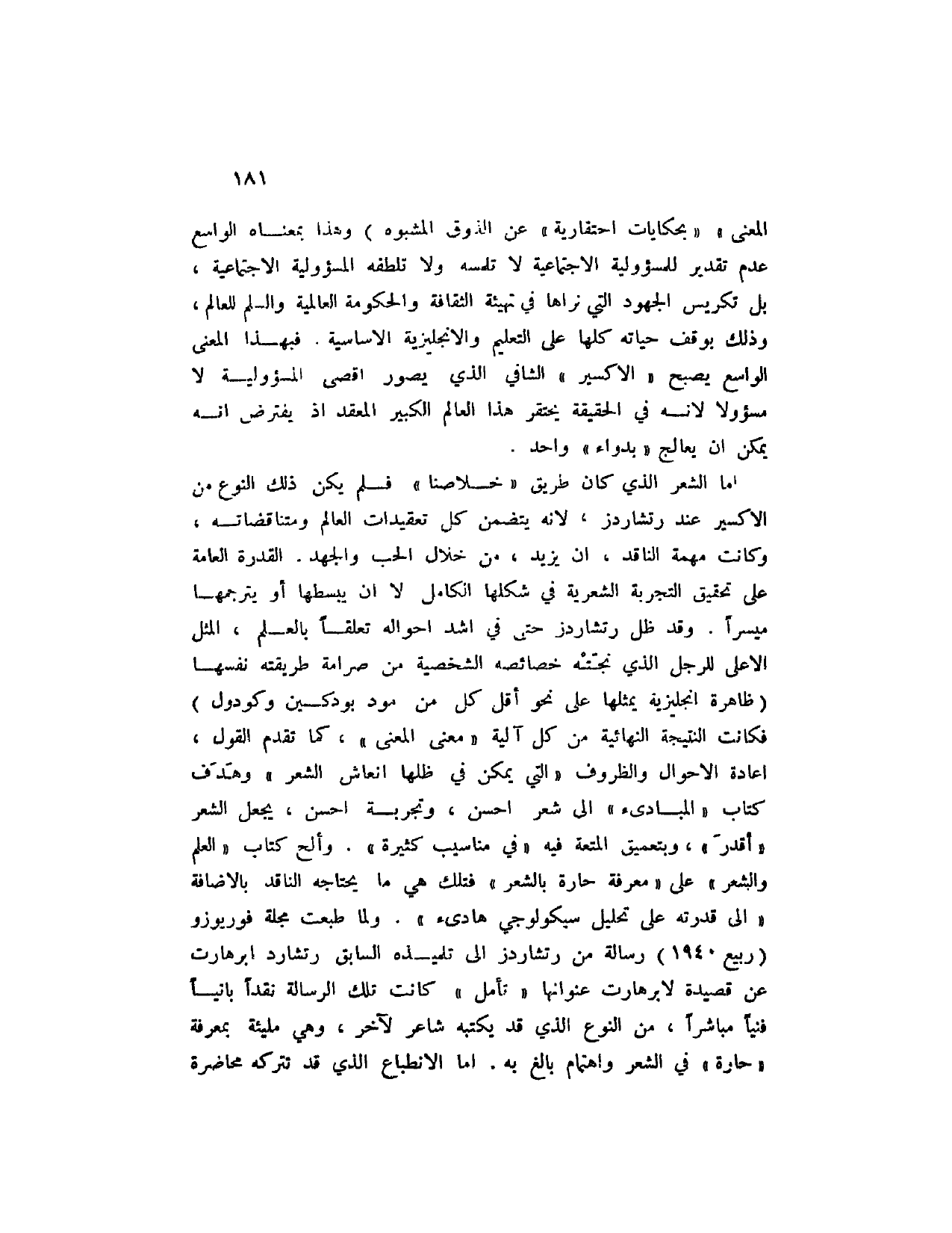 أما الشعر الذي كان طريق " خلاصنا " فلم يكن ذلك النوع من الإكسير عند رتشاردز، لأنه يتضمن كل تعقيدات العالم ومتناقضاته، وكانت مهمة الناقد، أن يزيد، من خلال الحب والجهد. القدرة العامة على تحقيق التجربة الشعرية في شكلها الكامل لا أن يبسطها أو أن يترجمها ميسراً. وقد ظل رتشاردز حتى في أشد أحواله تعلقاً لالعلم، المثل الأعلى للرجل الذي نجته خصائصه الشخصية من صرامة طريقته نفسها (ظاهرة إنجليزية يمثلها على نحو اقل كل من مود بودكين وكودول) فكانت النتيجة النهائية من كل آلية معنى المعنى "، كما تقدم القول، إعادة الأحوال والظروف " التي يمكن في ظلها إنعاش الشعر " وهدف كتاب " المبادئ " إلى شعر أحسن، وتجربة أحسن، يجعل الشعر " اقدر "، وبتعميق المتعة فيه " في مناسيب كثيرة ". وألح كتاب " العلم والشعر " على " معرفة حارة بالشعر " فتلك هي ما يحتاجه الناقد بالإضافة " إلى قدرته على تحليل سيكولوجي هادئ ". ولما طبعت مجلة فوريوزو (ربيع 1940) رسالة من رتشاردز إلى تلميذه السابق رتشاردز إبرهارت عن قصيدة لإبرهارت عنوانها " تأمل " كانت تلك الرسالة نقداً بانياً فنياً مباشراً، من النوع الذي قد يكتبه شاعر لآخر، وهي مليئة بمعرفة " حارة " في الشعر واهتمام بالغ به. أما الانطباع الذي قد تتركه محاضرة