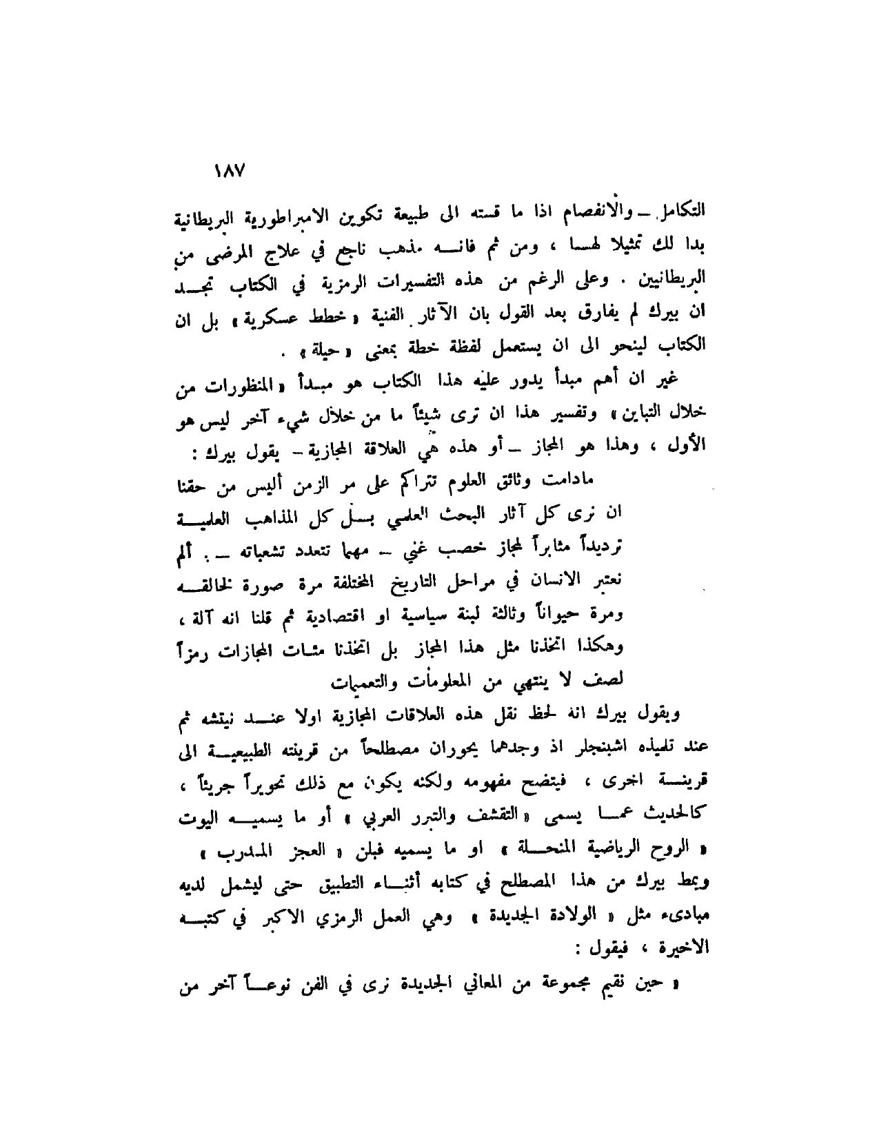 ما دامت وثائق العلوم تتراكم على مر الزمن أليس من حقنا ان نرى كل آثار البحث العلمي بل كل المذاهب العلمية ترديداً مثابراً لمجاز خصب غني - مهما تتعدد تشعباته -. ألم نعتبر حيواناً وثالثة لبنة سياسية أو اقتصادية ثم قلنا انه آلة، وهكذا اتخذنا مثل هذا المجاز بل اتخذنا مئات المجازات رمزاً لصف لا ينتهي من المعلومات والتعميمات.