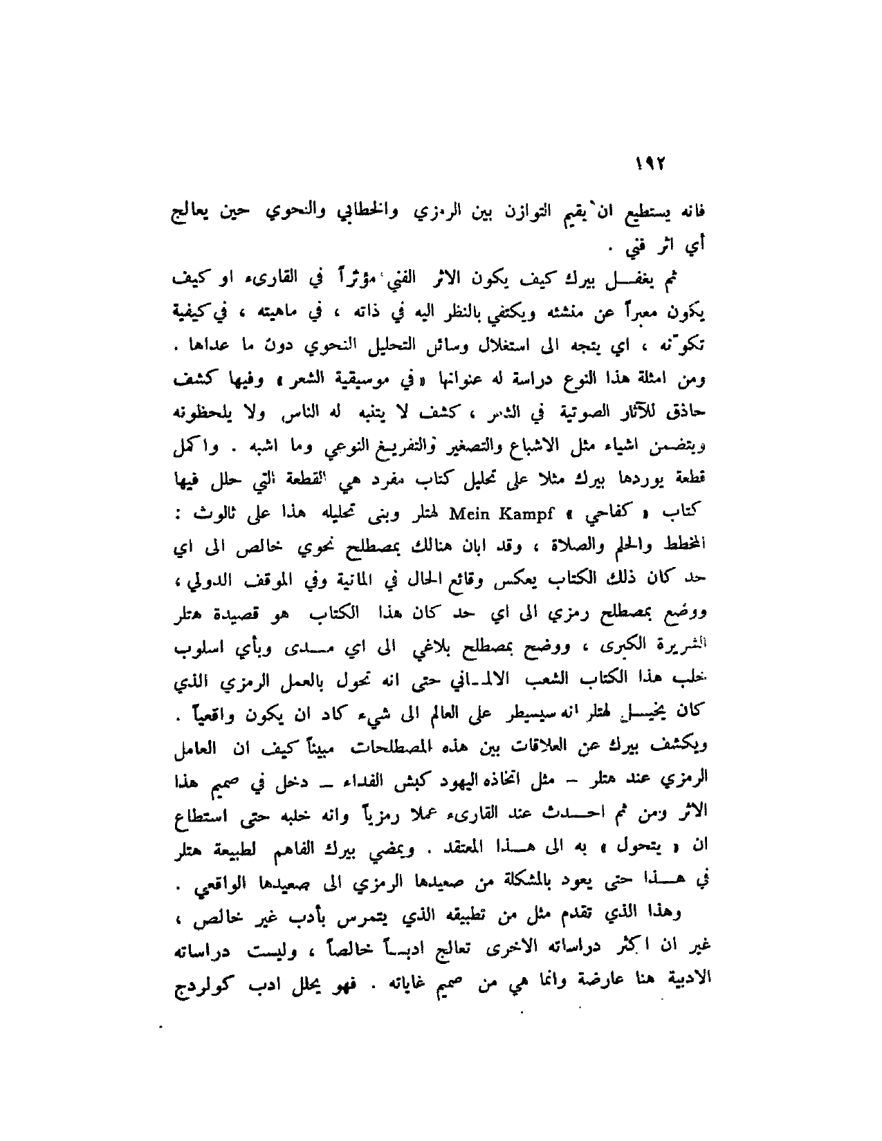 ثم يغفل بيرك كيف يكون الأثر الفني مؤثراً في القارئ أو كيف يكون معبراً عن منشئه ويكتفي بالنظر إليه في ذاته، في ماهيته، في كيفية تكونه، أي يتجه إلى استغلال وسائل التحليل النحوي دون ما عداها. ومن أمثلة هذا النوع دراسة له عنوانها " في موسيقية الشعر " وفيها كشف حاذق للآثار الصوتية في الشعر، كشف لا يتنبه له الناس ولا يلحظونه ويتضمن أشياء مثل الإشباع والتصغير والتفريغ النوعي وما أشبه. وأكمل قطعة يوردها بيرك مثلا على تحليل كتاب مفرد هي القطعة التي حلل فيها كتابه " كفاحي " Mein Kampf لهتلر وبنى تحليله هذا على ثالوث: المخطط والحلم والصلاة، وقد أبان هنالك بمصطلح نحوي خالص إلى أي حد كان ذلك الكتاب يعكس وقائع الحال في ألمانية وفي الموقف الدولي، ووضع بمصطلح رمزي إلى أي حد كان هذا الكتاب هو قصيدة هتلر الشريرة الكبرى، ووضح بمصطلح بلاغي إلى أي مدى وبأي أسلوب خلب هذا الكتاب الشعب الألماني حتى إنه تحول بالعمل الرمزي الذي كان يخيل لهتلر إنه سيسيطر على العالم إلى شيء كاد أن يكون واقعياً. ويكشف بيرك عن العلاقات بين هذه المصطلحات وبين كيف إن العامل الرمزي عند هتلر - مثل اتخاذه اليهود كبش الفداء - دخل في صميم هذا الأثر ومن ثم أحدث عند القارئ عملاً رمزياً وإنه خلبه حتى استطاع أن " يتحول " به إلى هذا المعتقد. ويمضي بيرك الفاهم لطبيعة هتلر في هذا حتى يعود المشكلة من صعيدها الرمزي إلى صعيدها الواقعي.
