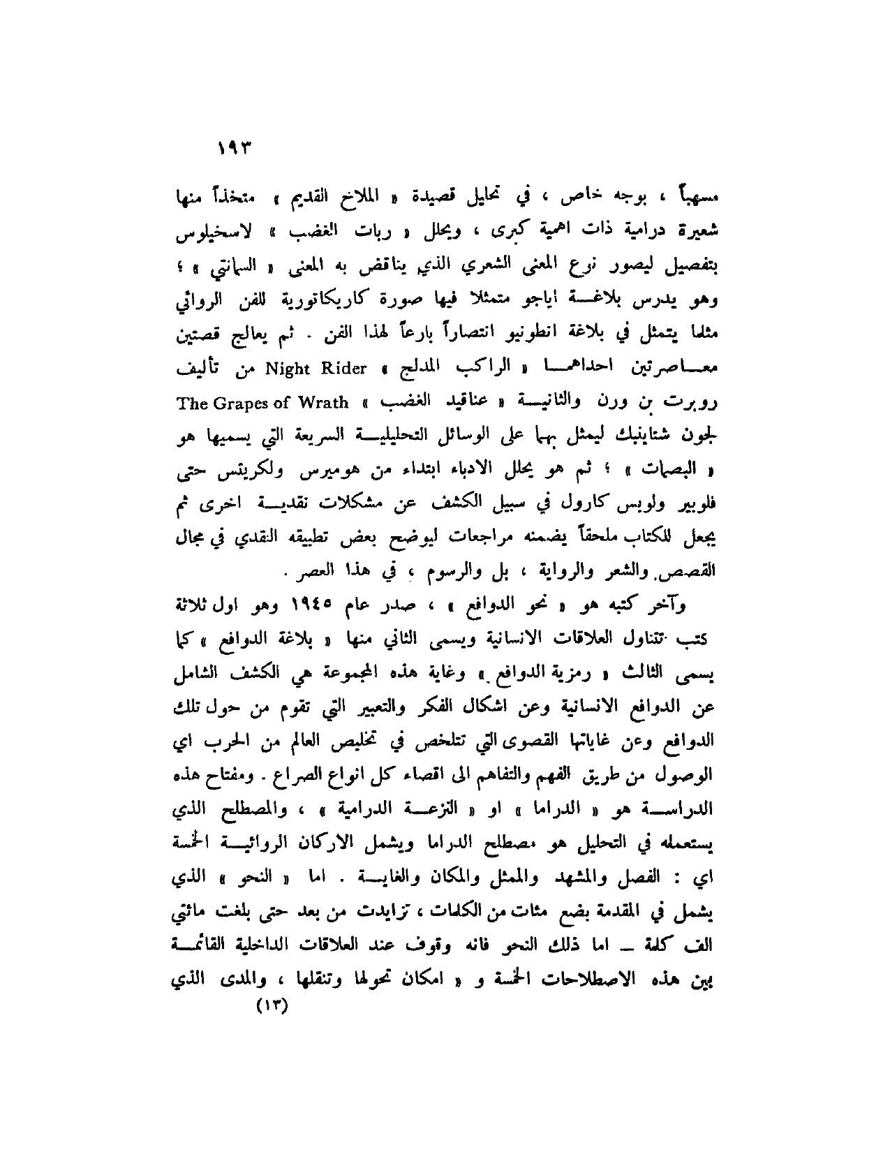 مسهباً، بوجه خاص، في تحليل قصيدة " الملاح القديم " متخذاً منها شعيرة درامية ذات أهمية كبرى، ويحلل " ربات الغضب " لأسخيلوس بتفصيل ليصور نوع المعنى الشعري الذي يناقض به المعنى " السمانتي "؛ وهو يدرس بلاغة أياجو متمثلا فيها صورة كاريكاتورية للفن الروائي مثلما يتمثل في بلاغة أنطونيو انتصاراً بارعا لهذا الفن. ثم يعالج قصتين معاصرتين إحداهما " الراكب المدلج " Night Rider من تأليف روبرت بن ورن والثانية " عناقيد الغضب " The Grapes of Wrath لجون شتاينبك ليمثل بهما على الوسائل التحليلية السريعة التي يسميها هو " البصمات "؛ ثم هو يحلل الأدباء ابتداء من هوميرس ولكريتس حتى فلوبير ولويس كارول في سبيل الكشف عن مشكلات نقدية أخرى ثم يجعل للكاتب ملحقاً يضمنه مراجعات ليوضح بعض تطبيقه النقدي في مجال القصص والشعر والرواية، بل والرسوم، في هذا العصر.