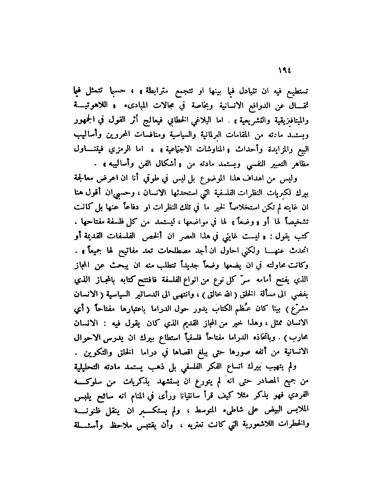 ولم يتهيب بيرك اتساع الفكر الفلسفي بل ذهب يستمد مادته التحليلية من جميع المصادر حتى انه لم يتورع ان يستشهد بذكريات من سلوكه الفردي فهو يذكر مثلا كيف قرأ سانتيانا ورأى في المنام انه سائح يلبس الملابس البيض على شاطئ المتوسطة، ولم يستكبر ان ينقل ظنونه والخطرات اللاشعورية التي كانت تعتريه، وأن يقتبس ملاحظ وأسئلة
