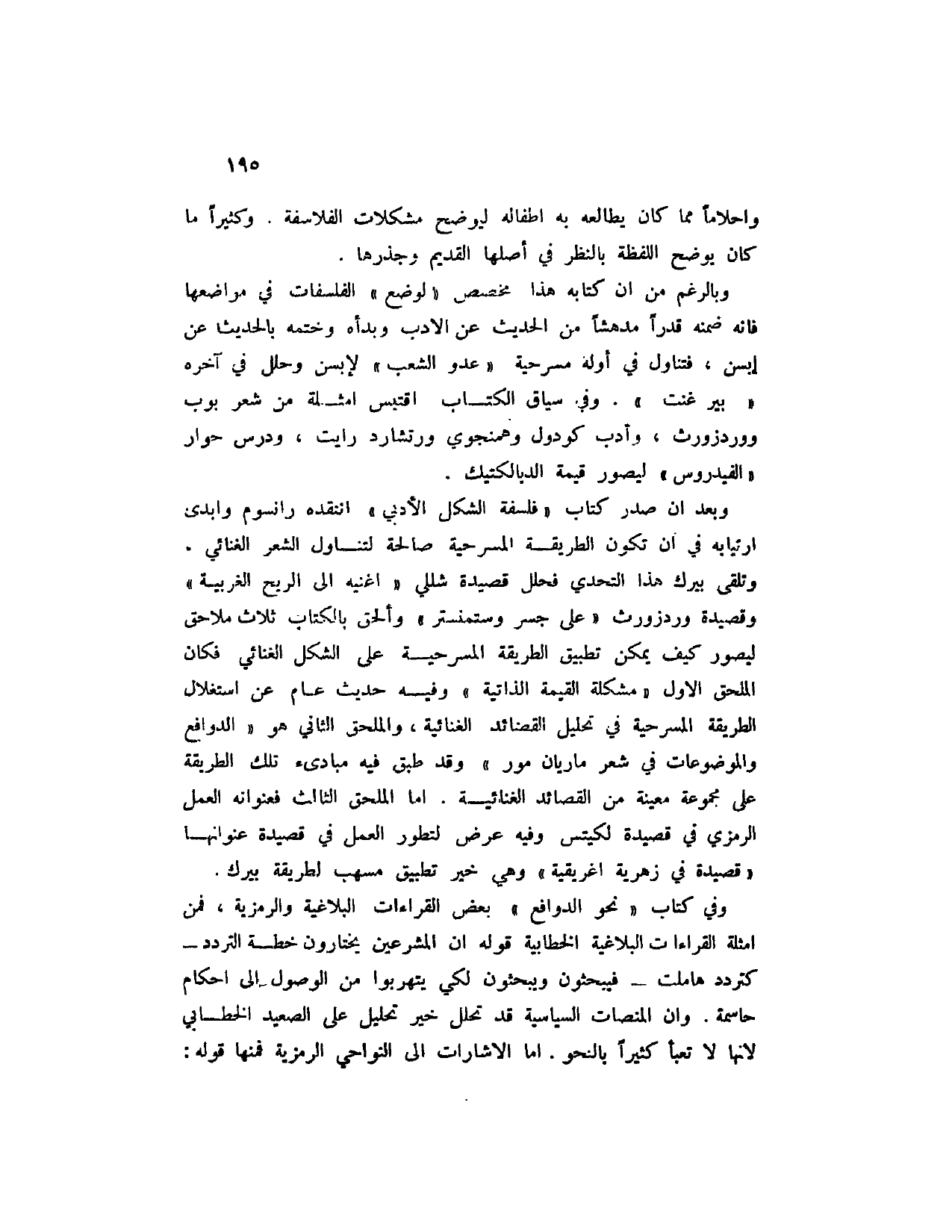 وبالرغم من أن كتابه هذا مخصص " لوضع " الفلسفات في مواضعها فانه ضمنه قدراً مدهشاً من الحديث عن الأدب وبدأه وختمه بالحديث عن إبسن، فتناول في أوله مسرحية " عدو الشعب " لإبسن وحلل في آخره " بير غنت ". وفي سياق الكتاب اقتبس أمثلة من شعر بوب ووردزوث، وأدب كودول وهمنجوي ورتشارد رايت، ودرس حوار " الفيدروس " ليصور قيمة الديالكتيك.