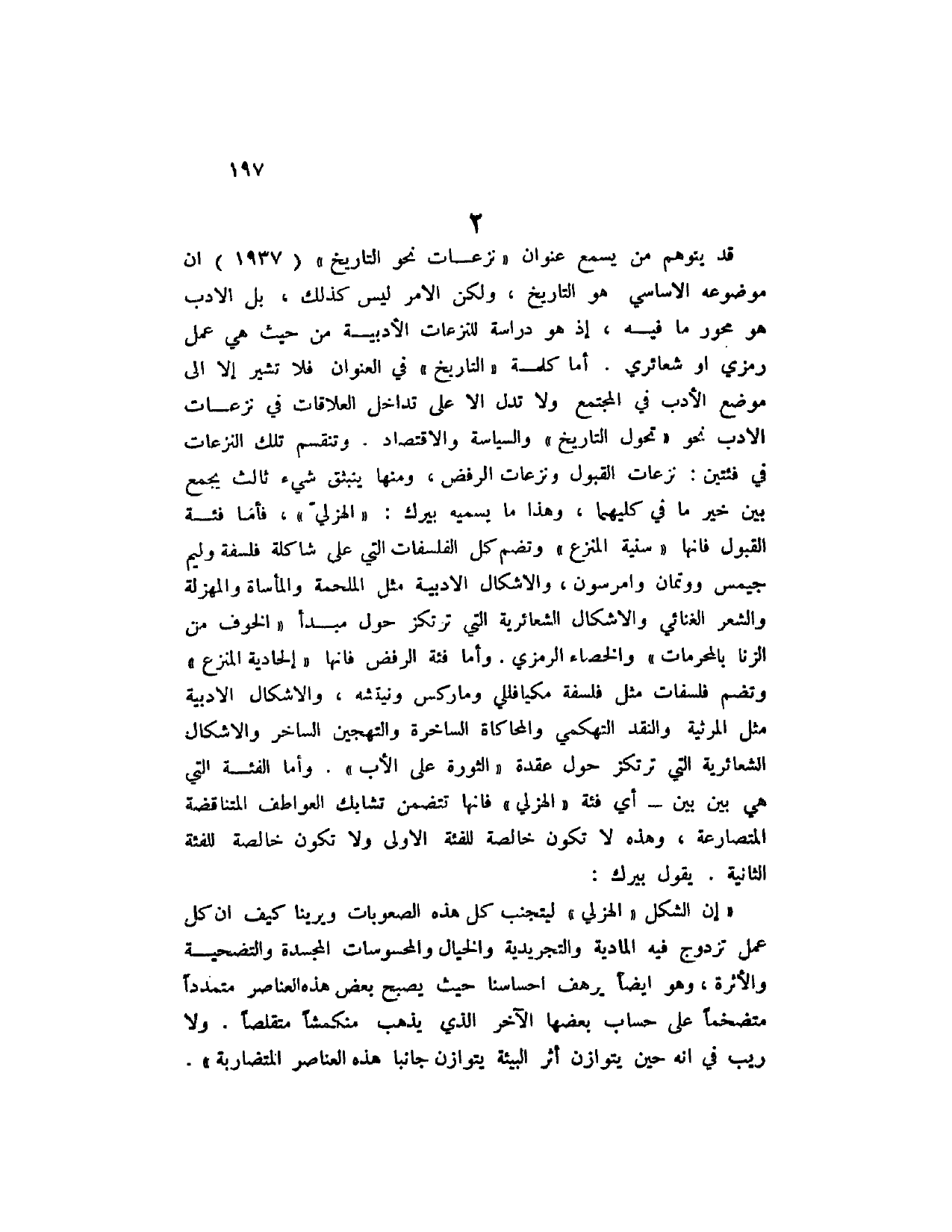 2 - قد يتوهم من يسمع عنوان " نزعات نحو التاريخ " (937) أن موضوعه الأساسي هو التاريخ، ولكن الأمر ليس كذلك، بل الأدب هو محور ما فيه، إذ هو دراسة للنزعات الأدبية من حيث هي عمل رمزي أو شعائري. أما كلمة " التاريخ " في العنوان فلا تشير إلا إلى موضع الأدب في المجتمع ولا تدل إلا على تداخل العلاقات في نزعات الأدب نحو " تحول التاريخ " والسياسية والاقتصاد. وتنقسم تلك النزعات في فئتين: نزعات القبول ونزعات الرفض، ومنها ينبثق شيء ثالث يجمع بين خير ما في كليهما، وهذا ما يسميه بيرك: " الهزلي) ، فأما فئة القبول فإنها " سنية المنزع " وتضم كل الفلسفات التي على شاكلة فلسفة وليم جيمس ووتمان وامرسون، والأشكال الأدبية مثل الملحمة والمأساة والمهزلة والشعر الغنائي والأشكال الشعائرية التي يرتكز حول مبدأ " الخوف من الزنا بالمحرمات " والخصاء الرمزي. وأما فئة الرفض فإنها " إلحادية المنزع " وتضم فلسفات مثل فلسفة ميكافللي وماركس ونيتشه، والأشكال الأدبية مثل المرثية والنقد التهكمي والمحاكاة الساخرة والتهجين الساخر والأشكال الشعائرية التي ترتكز حول عقدة " الثورة على الأب ". وأما الفئة التي هي بين بين - أي فئة " الهزلي " فإنها تتضمن تشابك العواطف المتناقضة المتصارعة، وهذه لا تكون خالصة للفئة الأولى ولا تكون خالصة للفئة الثانية. يقول بيرك: