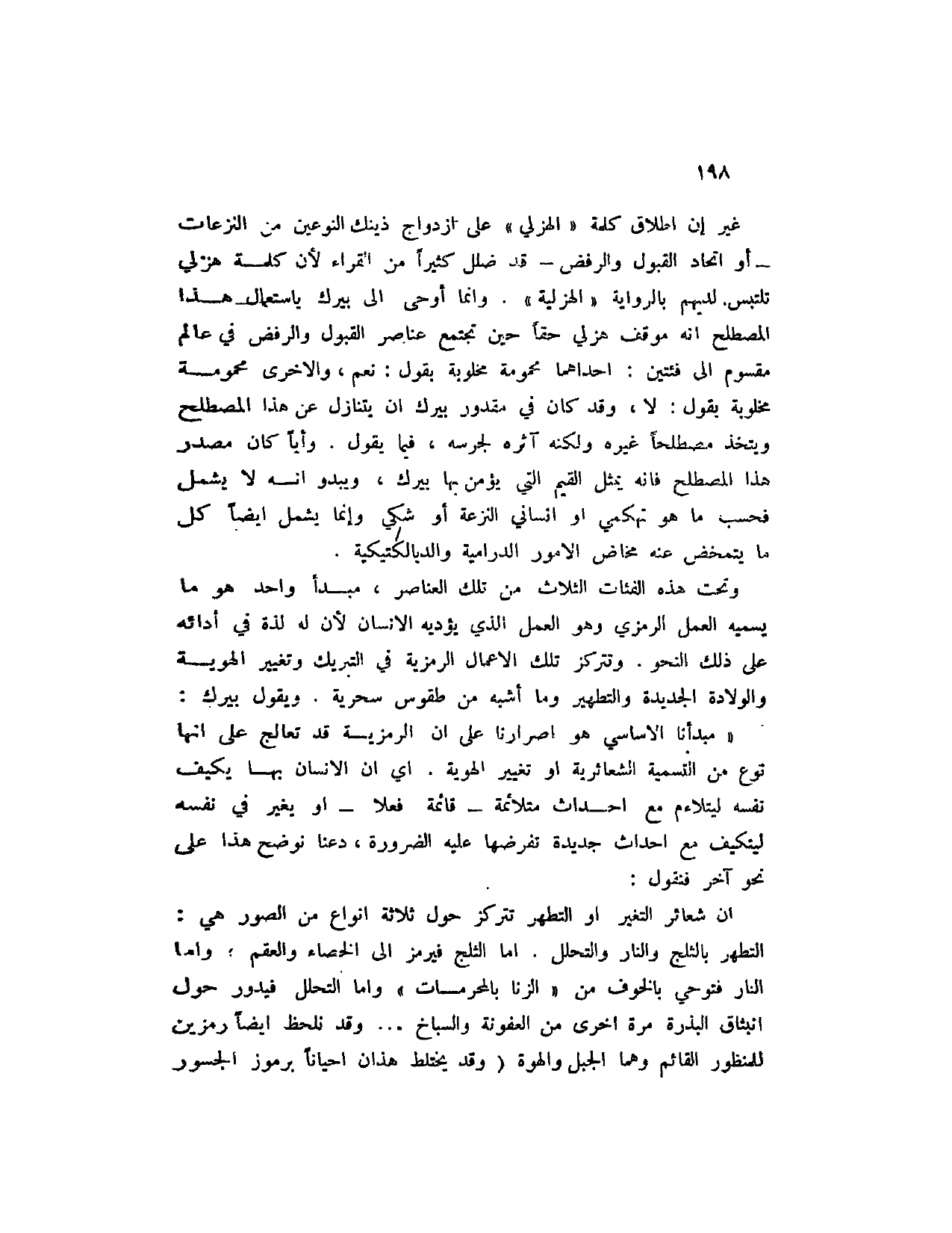 غير إن إطلاق كلمة " الهزلي " على ازدواج ذينك النوعين من النزعات - أو اتحاد القبول والرفض - قد ضلل كثيراً من القراء لان كلمة هزلي تلتبس لديهم بالرواية " الهزلية ". وإنما أوحى إلى بيرك باستعمال هذا المصطلح انه موقف هزلي حقاً حين تجتمع عناصر القبول والرفض في عالم مقسوم إلى فئتين: إحداهما مجموعة مخلوبة بقول: نعم، والأخرى محمومة مخلوبة بقول: لا، وقد كان في مقدور بيرك أن يتنازل عن هذا المصطلح ويتخذ مصطلحاً غيره ولكنه آثره لجرسه، فيما يقول. وأياً كان مصدر هذا المصطلح فانه يمثل القيم التي يؤمن بها بيرك، ويبدو انه لا يشمل فحسب ما هو تهكمي أو إنساني النزعة أو شكي وإنما يشمل أيضاً ما يتمخض عنه مخاض الأمور الدرامية والديالكتيكية.