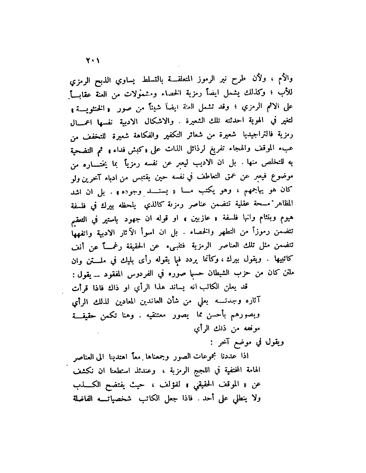والأم، ولأن طرح نير الرموز المتعلقة بالتسلط يساوي الذبح الرمزي للأب؛ وكذلك يشمل أيضاً رمزية الخصاء ومشمولات من العنة عقاباً على الأثم الرمزي؛ وقد تشمل العنة أيضاً شيئاً من صور " الخنثوية " لتغير في الهوية أحدثته تلك الشعيرة. والأشكال الأدبية نفسها أعمال رمزية فالتراجيديا شعيرة من شعائر التكفير والفكاهة شعيرة لتخفف من عبء الموقف والهجاء تفريغ لرذائل اللذات على " كبش فداء " ثم التضحية به للتخلص منها. بل إن الأديب ليعبر عن نفسه رمزياً بما يختاره من موضوع فيعبر عن عمق التعاطف في نفسه حين يقتبس من أدباء آخرين ولو كان هو يهاجم، وهو يكتب ما " يسند وجوده ". بل أن أشد المظاهر مسحة عقيلة تتضمن عناصر رمزية كالذي يلحظه بيرك في فلسفة هيوم وبنثام وإنما فلسفة " عازبين " أو قوله إن جهود باستير في التعقيم تتضمن رموزاً من التطهر والخصاء. بل إن أسوأ أي الآثار الأدبية وأتفهها تتضمن مثل تلك العناصر الرمزية فتنبئ عن الحقيقة رغماً عن أنف كاتبيها. ويقول بيرك، كأنما يردد فيما يقوله رأى بليك في ملتن وأن ملتن كان من حزب الشيطان حسبما صوره في الفردوس المفقود - يقول: