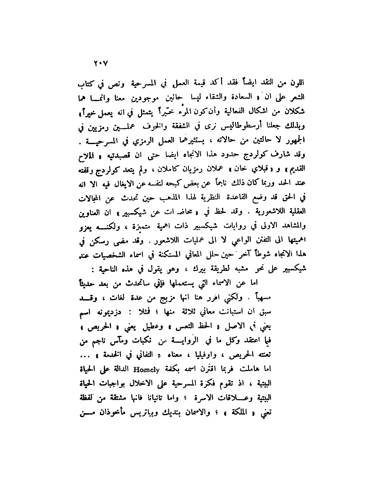 أما عن الأسماء التي يستعملها فإني سأتحدث من بعد حديثاً مسهباً. ولكني اقرر هنا أنها مزيج من عدة لغات، وقد سبق أن استبانت معاني ثلاثة منها؛ فمثلا: دزديمونه اسم يعني في الأصل " الحظ التعس " وعطيل يعني " الحريص " فيما اعتقد وكل ما في الرواية من نكبات ومآس ناجم من تعنته الحريص، وأوفيليا، معناه " التفاني في الخدمة "؟ أما هاملت فربما اقترن اسمه بكلمة Homely الدالة لى الحياة البيتية، إذ تقوم فكرة المسرحية على الإخلال بواجبات الحياة البيتية وعلاقات الأسرة؛ وأما تاتيانا فأنها مشتقة من لفظة تعني " الكلمة "؛ والاسمان بنديك وباتريس مأخوذان من