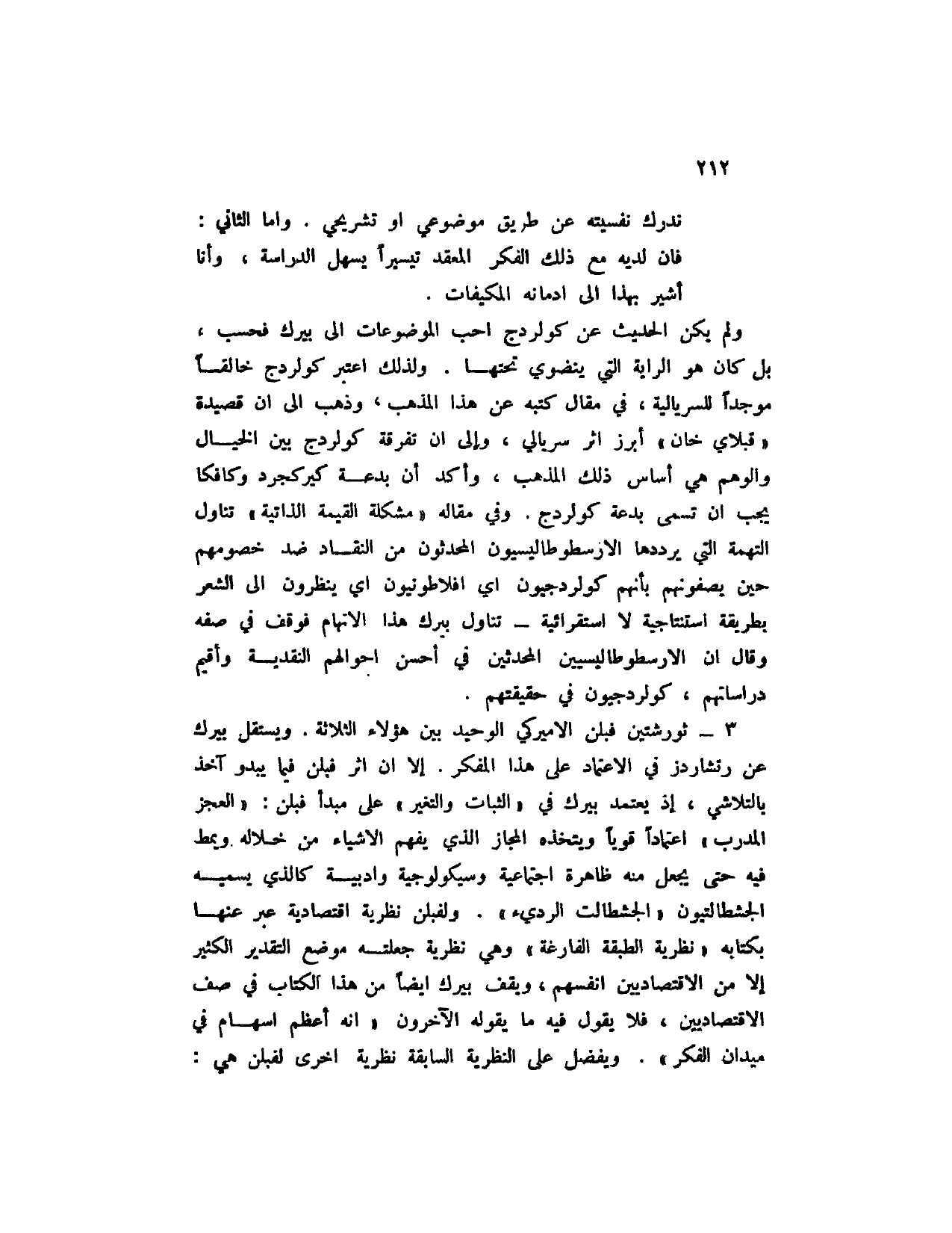 3 - ثورشتين فبلن الأميركي الوحيد بين هؤلاء الثلاثة. ويستقل بيرك عن رتشاردز في الاعتماد على هذا المفكر. إلا إن أثر فبلن فيما يبدو آخذ بالتلاشي، إذ يعتمد بيرك في " الثبات والتغير " على مبدأ فبلن: (العجز المدرب " اعتماداً قوياً ويتخذه المجاز الذي يفهم الأشياء من خلاله ويمط فيه حتى يجعل منه ظاهرة اجتماعية وسيكولوجية وأدبية كالذي يسميه الجشطالتيون " الجشطالت الردئ ". ولفبلن نظرية اقتصادية عبر عنها بكتابه " نظرية الطبقة الفارغة " وهي نظرية جعلته موضع التقدير الكثير إلا من الاقتصاديين أنفسهم، ويقف بيرك أيضاً من هذا الكتاب في صف الاقتصاديين، فلا يقول فيه ما يقوله الآخرون " انه اعظم إسهام في ميدان الفكر ". ويفضل على النظرية السابقة نظرية أخرى لفبلن هي:
