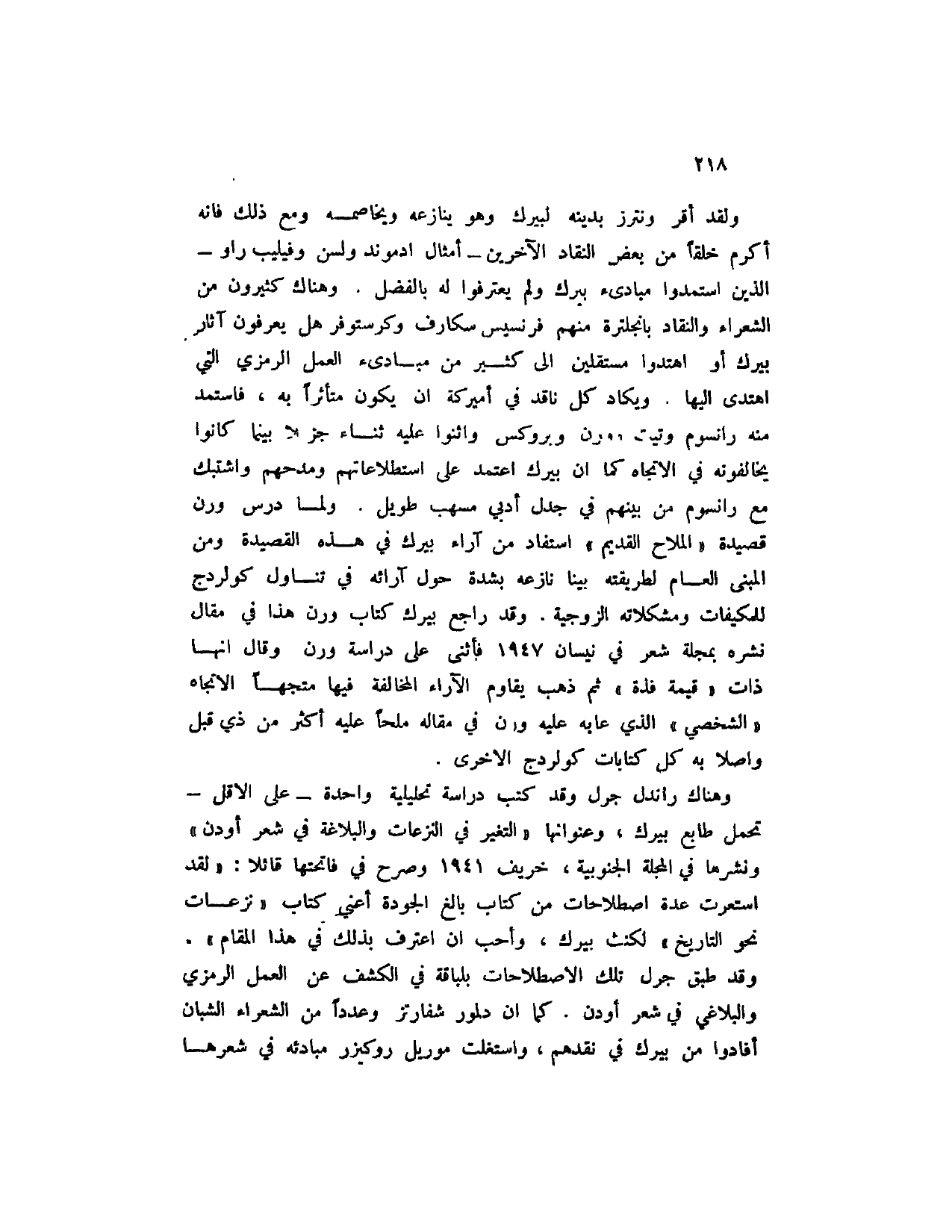 ولقد أقر ونترز بدينه لبيرك وهو ينازعه وهو ينازعه ويخاصمه ومع ذلك فانه أكرم خلقاً من بعض النقاد الآخرين - أمثال أدموند ولسن وفيليب راو - الذين استمدوا مبادئ بيرك ولم يعترفوا له بالفضل. وهناك كثيرون من الشعراء والنقاد بانجلترة منهم فرنسيسسكارف وكرستوفر هل يعرفون آثار بيرك أو اهتدوا مستقلين إلى كثير من مبادئ العمل الرمزي التي اهتدى إليها. ويكاد كل ناقد في أميركة أن يكون متأثراً به، فاستمد منه رانسوم وتيت وورن وبروكس واثنوا عليه ثناء جزيلا بينما كانوا يخالفونه في الاتجاه كما أن بيرك اعتمد على استطلاعاتهم ومدحهم واشتباك مع رانسوم من بينهم في جدل أدبي مسهب طويل. ولما درس ورن قصيدة " الملاح القديم " استفاد من آراء بيرك في هذه القصيدة ومن المبنى العام لطريقته بينا نازعه بشدة حول آرائه في تناول كولردج للمكيفات ومشكلاته الزوجية. وقد راجع بيرك كتاب ورن هذا في مقال نشره بمجلة شعر في نيسان 1947 فأثنى على دراسة ورن وقال إنها ذات " قيمة فذة " ثم ذهب يقاوم الآراء المخالفة فيها متجهاً الاتجاه " الشخصي " الذي عابه عليه ورن في مقاله ملحاً عليه أكثر من ذي قبل واصلاً به كل كتابات كولردج الأخرى.