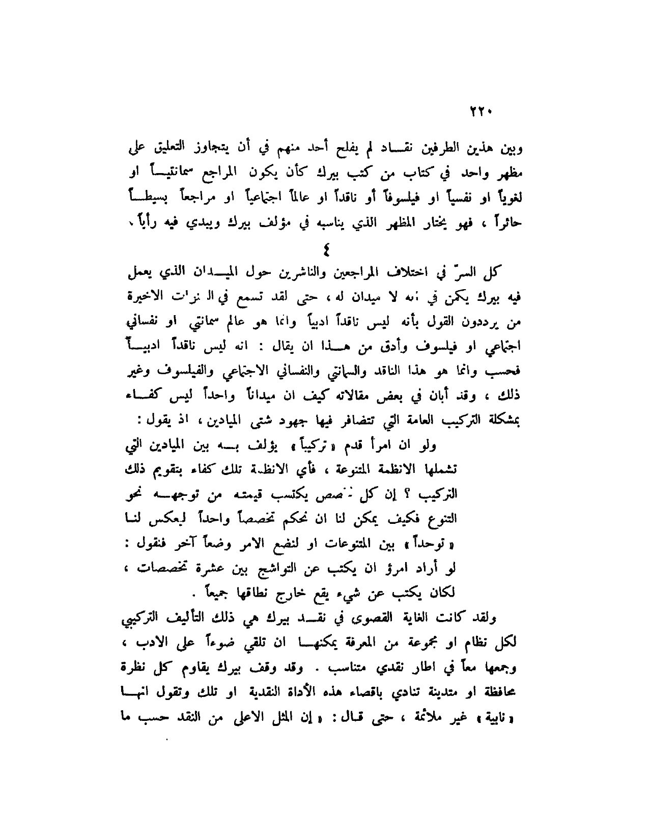 - كان السر في اختلاف المراجعين والناشرين حول الميدان الذي يعمل فيه بيرك يكمن في أنه لا ميدان له، حتى لقد تسمع في السنوات الأخيرة من يرددون القول بأنه ليس ناقداً أدبياً وإنما هو عالم سمانتي أو نفساني اجتماعي أو فيلسوف وأدق من هذا أن يقال: إنه ليس ناقداً أدبياً فحسب وإنما هو هذا الناقد والسمانتي والنفساني الاجتماعي والفيلسوف وغير ذلك، وقد أبان في بعض مقالاته كيف أن ميداناً واحداً ليس كفاء بمشكلة التركيب العامة التي تتضافر فيها جهود شتى الميادين، إذ يقول: