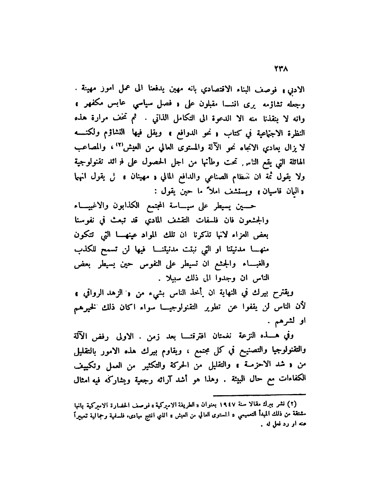 الأدبي " فوصف البناء الاقتصادي بأنه مهين يدفعنا إلى عمل أمور مهينة. وجعله تشاؤمه يرى إننا مقبلون على " فصل سياسي عابس مكفهر " وإنه لا ينقذنا منه إلا الدعوة إلى التكامل الذاتي. ثم تخف مرارة هذه النظرة الاجتماعية في كتاب " نحو الدوافع " ويقل فيها التشاؤم ولكنه لا يزال يعادي الاتجاه نحو الآلة والمستوى العالي من العيش (1) ، والمصاعب الهائلة التي يقع الناس تحت وطأتها من أجل الحصول على فوائد تقنولوجية ولا يقول ثمة أن النظام الصناعي والدافع المالي " مهينان " بل يقول إنهما " اليمان قاسيان " ويستشف أملاً ما حين يقول: