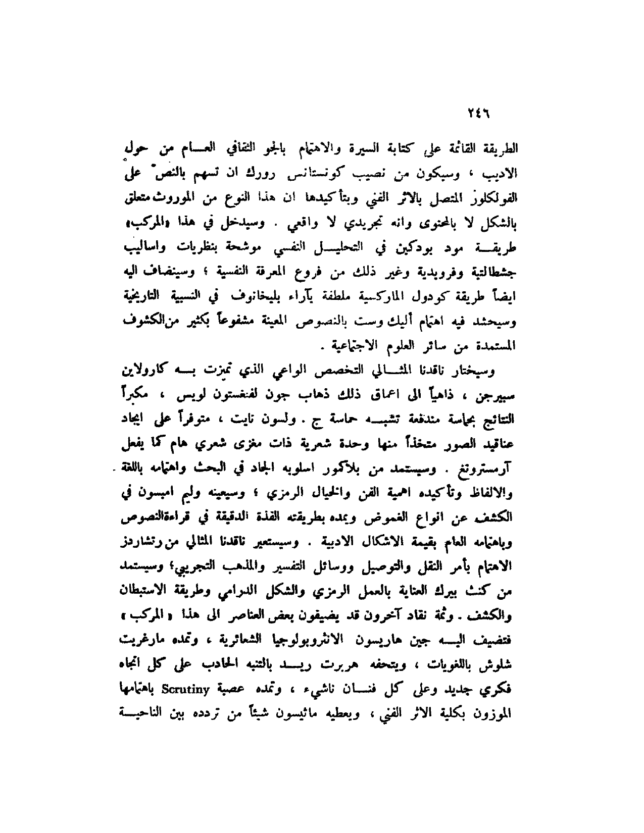 وسيختار ناقدنا المثالي التخصص الواعي الذي تميزت به كارولاين سبيرجن، ذاهباً إلى أعماق ذلك ذهاب جون لفنغستون لويس، مكبراً النتائج بحماسة مندفعة تشبه حماسة ج. ولسون نايت، متوفراً على إيجاد عناقيد الصور متخذاً منها وحدة شعرية ذات مغزى شعري هام كما يفعل آرمسترونغ. وسيستمد من بلاكمور أسلوبه الجاد في البحث واهتمامه باللغة والألفاظ وتأكيده أهمية الفن والخيال الرمزي؛ وسيعينه وليم امبسون في الكشف عن أنواع الغموض ويمده بطريقته الفذة الدقيقة في قراءة النصوص وباهتمامه العام بقيمة الأشكال الأدبية. وسيستعير ناقدنا المثالي من رتشاردز الاهتمام بأمر النقل والتوصيل ووسائل التفسير والمذهب التجريبي؛ وسيستمد من كنث بيرك العناية بالعمل الرمزي والشكل الدرامي وطريقة الاستبطان والكشف. وثمة نقاد آخرون قد يضيفون بعض العناصر إلى هذا " المركب " فتضيف إليه جين هاريسون الأنثروبولوجيا الشعائرية، وتمده مارغريت شلوش باللغويات، ويتحفه هربرت ريد بالتنبه الحادب على كل اتجاه فكري جديد وعلى كل فنان ناشيء، وتمده عصبة Scrutiny باهتمامها الموزون بكلية الأثر الفني، ويعطيه ماثيسون شيئاً من تردده بين الناحية