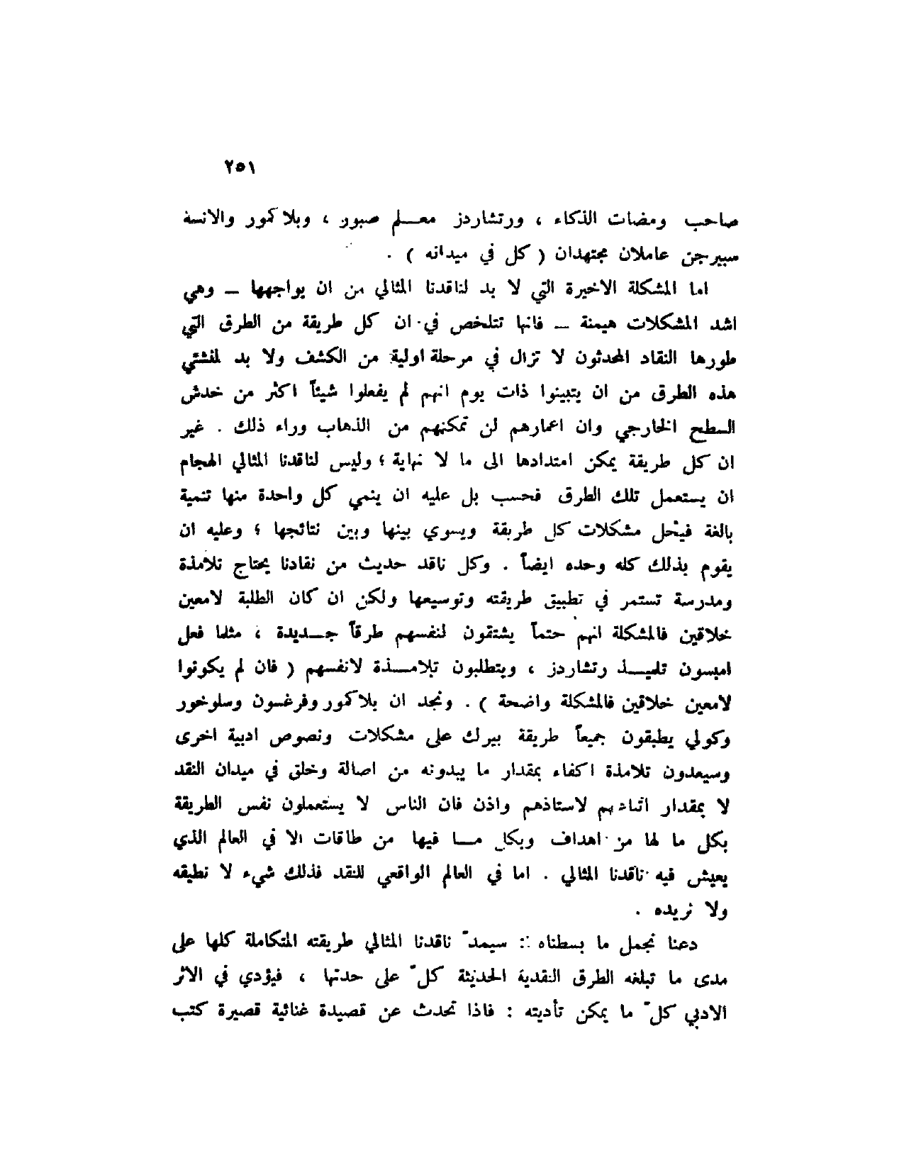 أما المشكلة الأخيرة التي لابد لناقدنا المثالي من أن يواجهها - وهي اشد المشكلات هيمنة - فإنها تتلخص في أن طريقة من الطرق التي طورها النقاد المحدثون لا تزال في مرحلة أولية من الكشف ولابد لمنشئي هذه الطرق من أن يتبينوا ذات يوم انهم لم يفعلوا شيئاً أكثر من خدش السطح الخارجي وأن أعمارهم لن تمكنهم من الذهاب وراء ذلك. غير أن كل طريقة يمكن امتداها إلى ما لا نهاية؛ وليس لناقدنا المثالي الهجام أن يستعمل تلك الطرق فحسب بل عليه أن ينمي كل واحدة منها تنمية بالغة فيحل مشكلات كل طريقة ويسوي بينها وبين نتائجها؛ وعليه أن يقوم بذلك كله وحده أيضا. وكل ناقد حديث من نقادنا يحتاج تلامذة ومدرسة تستمر في تطبيق طريقته وتوسيعها ولكن أن كان الطلبة لامعين خلاقين فالمشكلة انهم حتماً يشتقون لنفسهم طرقاً جديدة، مثلما فعل امبسون تلميذ رتشاردز، ويتطلبون تلامذة لانفسهم (فان لم يكونوا لامعين خلاقين فالمشكلة واضحة) . ونجد أن بلاكمور وفرغسون وسلوخور وكولي يطبقون جميعاً طريقة بيرك على مشكلات ونصوص أدبية أخرى وسيعدون تلامذة أكفاء بمقدار ما يبدونه من أصالة وخلق في ميدان النقد لا بالمقدار اتباعهم لأستاذهم وإذن فان الناس لا يستعملون نفس الطريقة بكل ما لها من أهداف وبكل ما فيها من طاقات غلا في العالم الذي يعيش فيه ناقدنا المثالي. أما في العالم الواقعي للنقد فذلك شيء لا نطيقه ولا نريده.