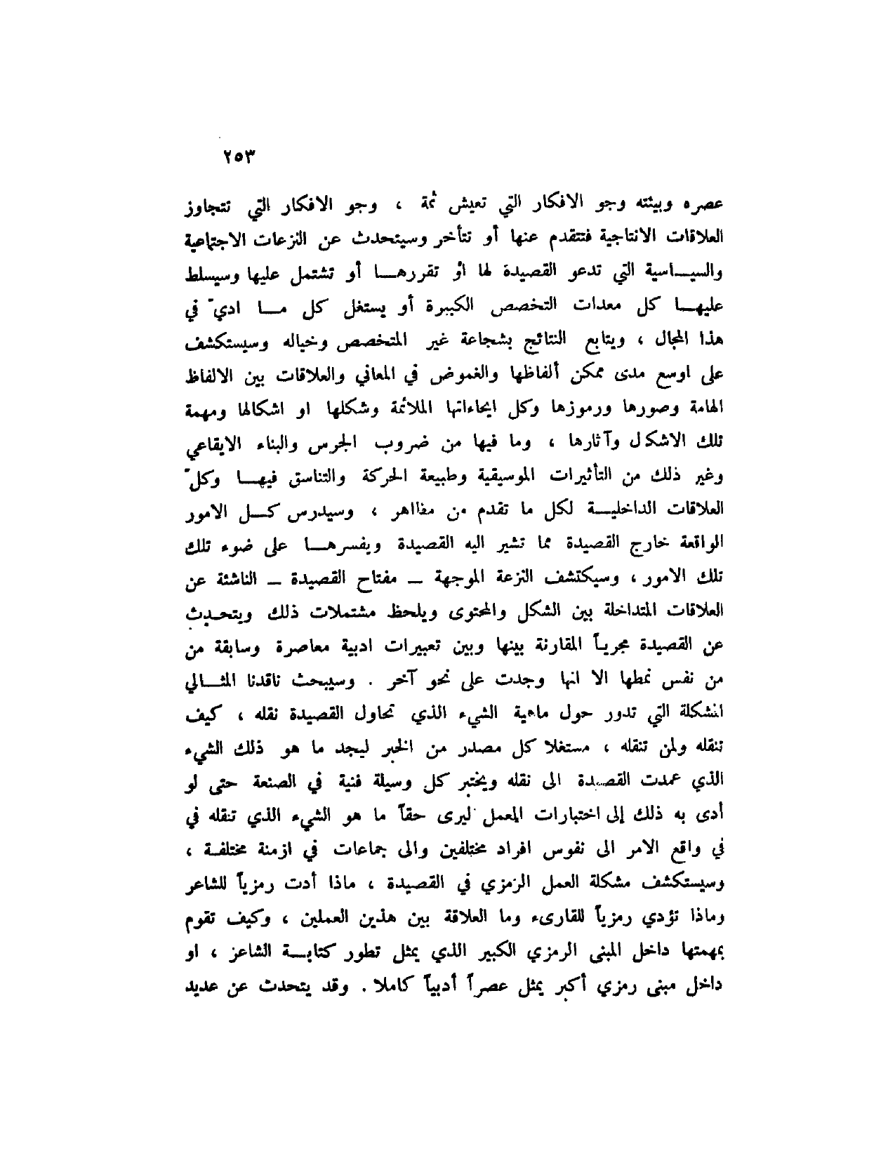 عصره وبيئته وجو الأفكار التي تعيش ثمة، وجو الأفكار التي تتجاوز العلاقات الإنتاجية فتتقدم عنها أو تتأخر وسيتحدث عن النزعات الاجتماعية والسياسية التي تدعو القصيدة لها أو تقررها أو تشمل عليها وسيسلط عليها كل معدات التخصص الكبيرة أو يستغل كل ما أدي في هذا المجال، ويتابع النتائج بشجاعة غير المتخصص وخياله وسيكتشف على أوسع مدى ممكن ألفاظها والغموض في المعاني والعلاقات بين الألفاظ الهامة وصورها ورموزها وكل إيحاءاتها الملائمة وشكلها أو أشكالها ومهمة تلك الأشكال وآثارها، وما فيها من ضروب الجرس والبناء الإيقاعي وغير ذلك من التأثيرات الموسيقية وطبيعة الحركة والتناسق فيها وكل العلاقات الداخلية لكل ما تقدم من مظاهر، وسيدرس كل الأمور الواقعة خارج القصيدة مما يشير غليه القصيدة ويفسرها على ضوء تلك الأمور، وسيكتشف النزعة الموجهة - مفتاح القصيدة - الناشئة عن العلاقات المتداخلة بين الشكل والمحتوى ويلحظ مشتملات ذلك ويتحدث عن القصيدة مجرياً المقارنة بينها وبين تعبيرات أدبية معاصرة وسابقة من نفس نمطها إلا أنها وجدت على نحو آخر. وسيبحث ناقدنا المثالي المشكلة التي تدور حول ماهية الشيء الذي تحاول القصيدة نقله، كيف تنقله ولمن تنقله، مستغلا كل مصدر من الخبر ليجد ما هو ذلك الشيء الذي عمدت القصيدة إلى نقله ويختبر كل وسيلة فنية في الصنعة حتى لو أدى به ذلك إلى اختبارات المعمل ليرى حقاً ما هو الشيء الذي تنقله في واقع الأمر إلى نفوس أفراد مختلفين وإلى جماعات في أزمنة مختلفة، وسيكتشف مشكلة العمل الرمزي في القصيدة، ماذا أدت رمزياً للشاعر وماذا تؤدي رمزياً للقارئ وما العلاقة بين هذين العملين، وكيف تقوم بمهمتها داخل المبنى الرمزي الكبير الذي يمثل تطور كتابة الشاعر، داخل مبنى رمزي أكبر يمثل عصراً أدبياً كاملا. وقد يتحدث عن عديد