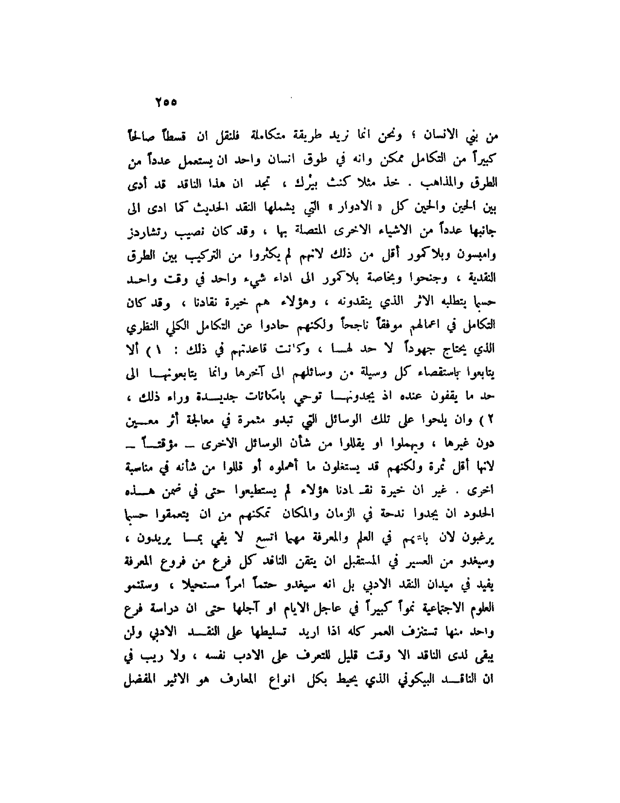 من بني الإنسان؛ ونحن إنما نريد طريقة متكاملة فلنقل أن قسطاً صالحاً كبيراً من التكامل ممكن وإنه في طوق إنسان واحد أن يستعمل عدداً من الطرق والمذاهب. خذ مثلاً كنث بيرك، تجد أن هذا النقد قد أدى بين الحين والحين كل " الأدوار " التي يشملها النقد الحديث كما أدى إلى جانبها عدداً من الأشياء الأخرى المتصلة بها، وقد كان نصيب رتشاردز وإمبسون وبلاكمور أقل من ذلك لأنهم لم يكثروا من التركيب بين الطرق النقدية، وجنحوا وبخاصة بلاكمور إلى أداء شيء واحد في وقت واحد حسبما يتطلبه الأثر الذي ينقدونه، وهؤلاء هم خيرة نقادنا، وقد كان التكامل في أعمالهم موفقاً ناجحاً ولكنهم حادوا عن التكامل الكلي النظري الذي يحتاج جهوداً لا حد لها، وكانت قاعدتهم في ذلك: 1) ألا يتابعوا باستقصاء كل وسيلة من وسائلهم إلى آخرها وإنما يتابعونها إلى حد ما يقفون عنده إذ يجدونها توحي بإمكانات جديدة وراء ذلك، 2) وأن يلحوا على تلك الوسائل التي تبدو مثمرة في معالجة أثر معين دون غيرها، ويهملوا أو يقللوا من شأن الوسائل الأخرى - مؤقتاً - لأنها أقل ثمرة ولكنه قد يستغلون ما أهملوه أو قللوا من شأنه في مناسبة أخرى. غير أن خيرة نقادنا هؤلاء لم يستطيعوا حتى في ضمن هذه الحدود أن يجدوا ندحة في الزمان والمكان تمكنه من أن يتعمقوا حسبما يرغبون لأن باعهم في العلم والمعرفة مهما اتسع لا في بما يريدون، وسيغدوا من العسير في المستقبل أن يتقن الناقد كل فرع من فروع المعرفة يفيد في ميدان النقد الأدبي بل انه سيغدو حتماً أمراً مستحيلا، وستنمو العلوم الاجتماعية نمواً كبيراً في عاجل الأيام أو آجلها حتى أن دراسة فرع واحد منها تستنزف العمر كله إذا أريد تسليطها على النقد الأدبي ولن يبقى لدى الناقد إلا وقت قليل للتعرف على الأدب نفسه، ولا ريب في أن الناقد البيكوني الذي يحيط بكل أنواع المعارف هو الأثير المفضل