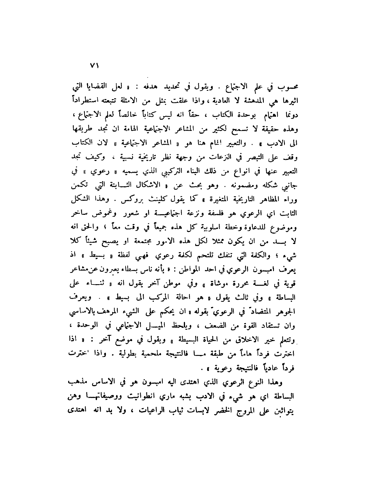 محسوب في علم الاجتماع. ويقول في تحديد هدفه: " لعل القضايا التي أثيرها هي المدهشة لا العادية، وإذا علقت بمثل من الأمثلة تتبعته استطراداً دونما اهتمام بوحدة الكتاب، حقاً انه ليس كتاباً خالصاً لعلم الإجتماع، وهذه حقيقة لا تسمح لكثير من المشاعر الاجتماعية الهامة ان تجد طريقها إلى الأدب ". والتعبير الهام هنا هو " المشاعر الاجتماعية " لان الكتاب وقف على التبصر في النزعات من وجهة نظر تاريخية نسبية، وكيف تجد التعبير عنها في أنواع من ذلك البناء التركيبي الذي يسميه " رعوي " في جانبي شكله ومضمونه. وهو بحث عن " الأشكال الثابتة التي تكمن وراء المظاهر التاريخية المتغيرة " كما يقول كلينث بروكس. وهذا الشكل الثابت أي الرعوي هو فلسفة ونزعة اجتماعية أو شعور وغموض ساخر وموضوع للدعاوى وخطة أسلوبية كل هذه جميعاً في وقت معاً؛ والحق أنه لابد ان يكون ممثلا لكل هذه الأمور مجتمعة أو يصبح شيئاً كلا شيء؛ والكلمة التي تنفك تلتحم بكلمة رعوي فهي لفظة " بسيط " إذا يعرف إمبسون الرعوي في أحد المواطن: " بأنه ناس بسطاء يعبرون عن مشاعر قوية في لغة محررة موشاة " وفي موطن آخر يقول أنه " ثناء على البساطة " وفي ثالث يقول " هو إحالة المركب إلى بسيط ". ويعرف الجوهر المتضاد في الرعوي بقوله " أن يحكم على الشيء المرهف بالأساسي وان تستقاد القوة من الضعف، ويلحظ الميل الاجتماعي في الوحدة، وتتعلم خير الأخلاق من الحياة البسيطة " ويقول في موضع آخر: " إذا اخترت فرداً هاماً من طبقة ما فالنتيجة ملحمية بطولية. وإذا اخترت فرداً عادياً فالنتيجة رعوية ".