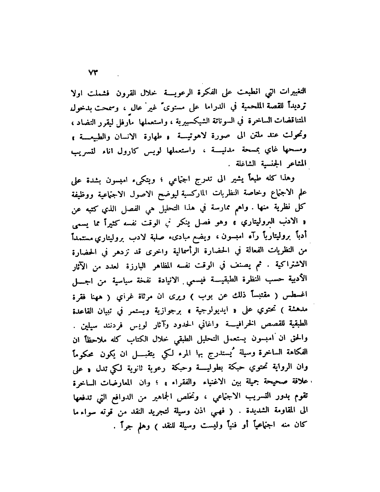 وهذا كله طبعاً يشير إلى تدرج اجتماعي؛ ويتكئ إمبسون بشدة على علم الاجتماع وخاصة النظريات الماركسية ليوضح الأصول الاجتماعية ووظيفة كل نظرية منها. وأهم ممارسة في هذا التحليل هي الفصل الذي كتبه عن " الأدب البروليتاري " وهو فصل ينكر في الوقت نفسه كثيراً مما يسمى أدباً بروليتارياً رآه امبسون، ويضع مبادئ صلبة لأدب بروليتاري مستمداً من النظريات الفعالة في الحضارة الرأسمالية وأخرى قد تزدهر في الحضارة الاشتراكية. ثم يصنف في الوقت نفسه المظاهر البارزة لعدد من الآثار الأدبية حسب النظرة الطبقية فيسمي الانيادة نفخة سياسية من اجل أغسطس (مقتبساً ذلك عن بوب) ويرى أن مرثاة غراي (ههنا فقرة مدهشة) تحتوي على " أيديولوجية " برجوازية ويستمر في تبيان القاعدة الطبقية للقصص الخرافية وأغاني الحدود وآثار لويس فردنند سيلين. والحق أن امبسون يستعمل التحليل الطبقي خلال الكتاب كله ملاحظاً أن الفكاهة الساخرة وسيلة يستدرج بها المرء لكي يتقبل أن يكون محكوماً وان الرواية تحتوي حبكة بطولية وحبكة رعوية ثانوية لكي تدل " على علاقة صحيحة جميلة بين الأغنياء والفقراء "؛ وان المعارضات الساخرة تقوم بدور التسريب الاجتماعي، وتخلص الجماهير من الدوافع التي تدفعها إلى المقاومة الشديدة. (فهي إذن وسيلة لتجريد النقد من قوته سواء ما كان منه اجتماعياً أو فنياً وليست وسيلة للنقد) وهلم جراً.
