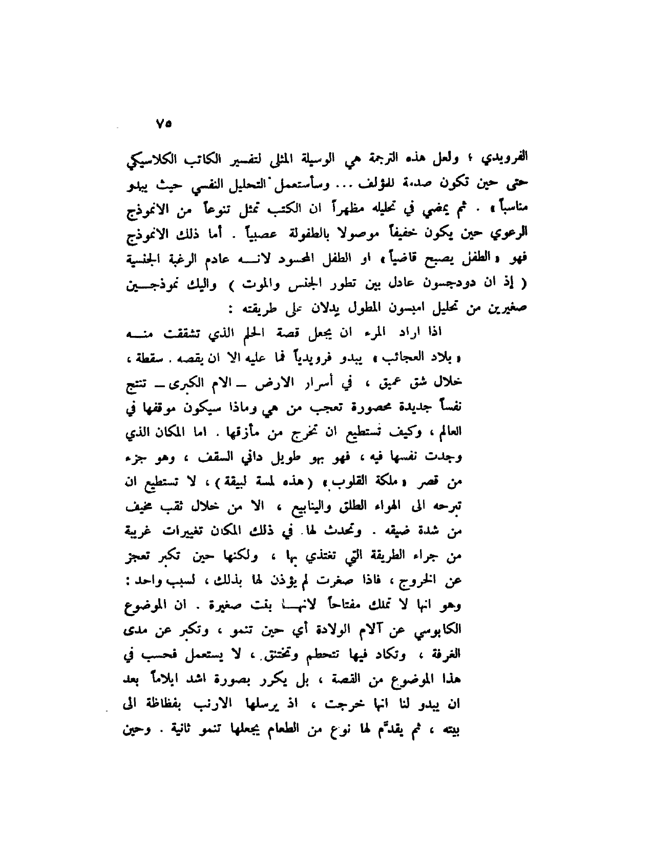 الفرويدي؛ ولعل هذه الترجمة هي الوسيلة المثلى لتفسير الكاتب الكلاسيكي حتى حين تكون صدمة للمؤلف؟ وسأستعمل التحليل النفسي حيث يبدو مناسباً ". ثم يمضي في تحليله مظهراً أن الكاتب تمثل تنوعاً من الأنموذج الرعوي حين يكون خفيفاً موصلا بالطفولة عصبياً. أما ذلك الأنموذج فهو " الطفل يصبح قاضياً " أو الطفل المحسود لأنه عادم الرغبة الجنسية (إذ أن دودجسون عادل بين تطور الجنس والموت) وإليك نموذجين صغيرين من تحليل أمبسون المطول يدلان على طريقته: