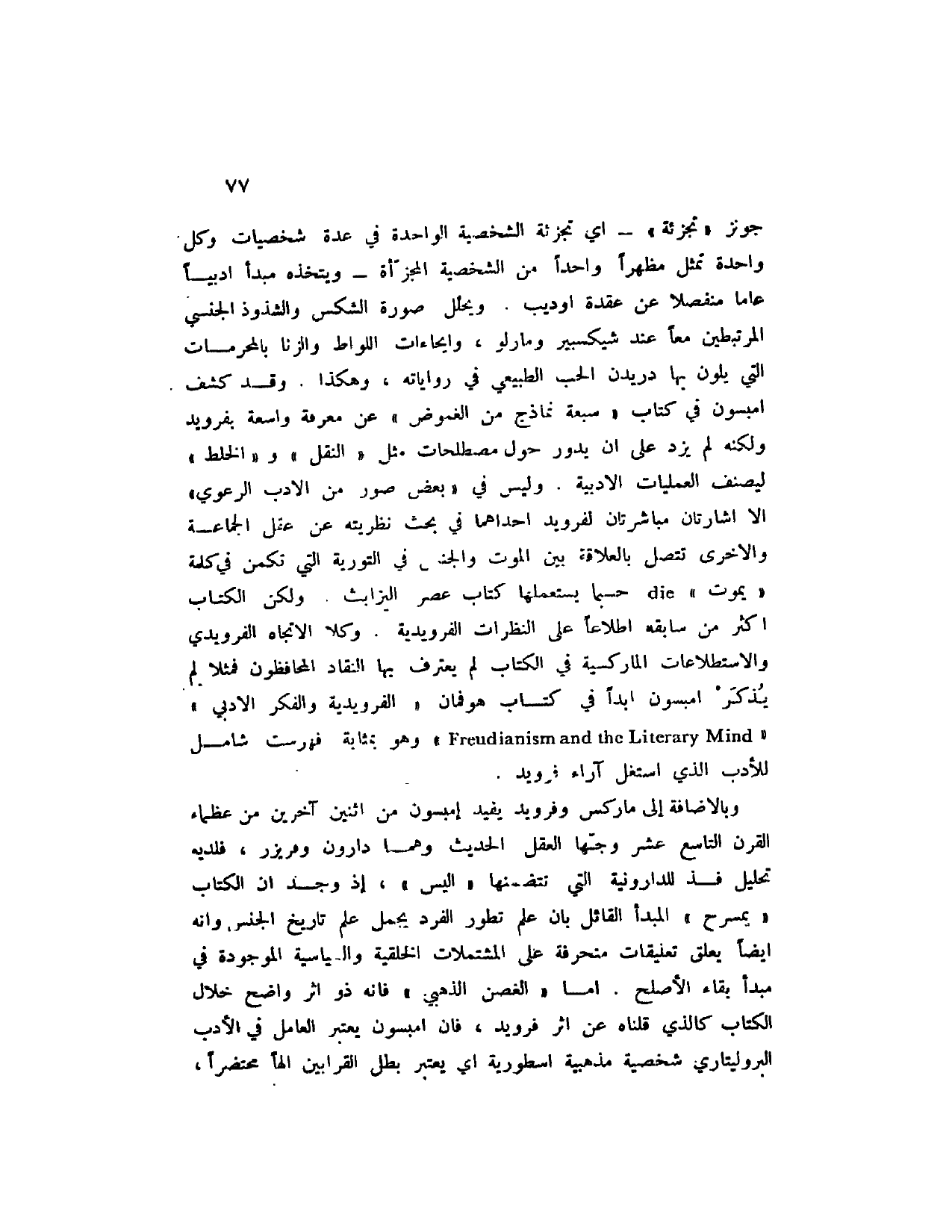 جونز " تجزئة " - أي تجزئة الشخصية الواحدة في عدة شخصيات وكل واحدة تمثل مظهراً واحداً من الشخصية المجزاة - ويتخذه مبدأ أدبياً عاماً منفصلا عن عقدة أوديب. ويحلل صورة الشكس والشذوذ الجنسي المرتبطين معاً عند شيكسبير ومارلو، وإيحاءات اللواط والزنا بالمحرمات التي يلون بها دريدن الحب الطبيعي في رواياته، وهكذا. وقد كشف أمبسون في كتاب " سبعة نماذج من الغموض " عن معرفة واسعة بفرويد ولكنه لم يزد على أن يدور حول مصطلحات مثل " النقل " و " الخلط " ليصنف العمليات الأدبية. وليس في " بعض صور من الأدب الرعوي " إلا إشارتان مباشرتان لفرويد إحداهما في بحث نظريته عن عقل الجماعة والأخرى تتصل بالعلاقة بين الموت والجنس في التورية التي تكمن في كلمة " يموت " die حسبما يستعملها كتاب عصر اليزابث. ولكن الكتاب أكثر من سابقه اطلاعاً على النظرات الفرويدية. وكلا الاتجاه الفرويدي والاستطلاعات الماركسية في الكتاب لم يعترف بها النقاد المحافظون فمثلا لم يذكر امبسون أبداً في كتاب هوفمان (الفرويدية والفكر الأدبي " " Freudianism and the Literary Mind " وهو بمثابة فهرست شامل للأدب الذي استغل آراء فرويد.