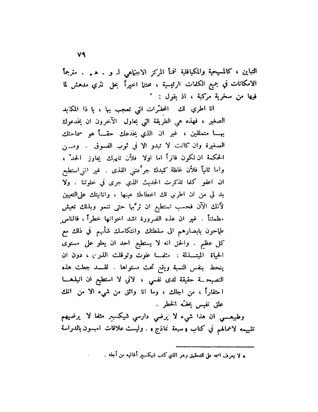 التباين، كالمسيحية والميكافلية مخمناً المركز الاجتماعي ل و. هـ (1) . مترجماً الإمكانات في جميع الكلمات الرئيسية، مختتما خيراً بحل نثري مدهش لما فيها من سخرية مركبة، إذ يقول: