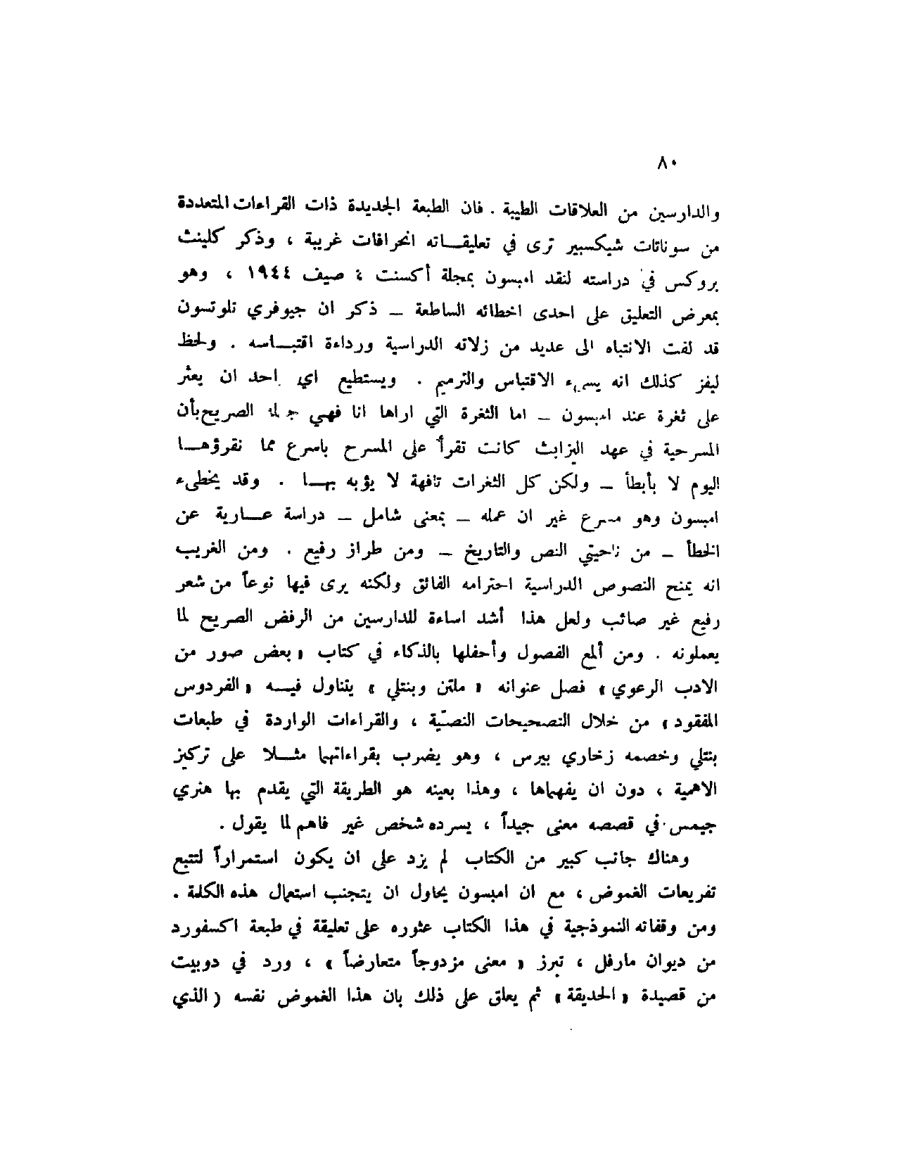 والدارسين من العلاقات الطيبة. فإن الطبعة الجديدة ذات القراءات المتعددة من سوناتات شيكسبير ترى تعليقاته انحرافات غريبة، وذكر كلينث بروكس في دراسته لنقد إمبسون بمجلة أكسنت، صيف 1944، وهو بمعرض التعليق على إحدى أخطائه الساطعة - ذكر أن جيوفري تلوتسون قد لفت الانتباه إلى عديد من زلاته الدراسية ورداءة اقتباسه. ولحظ ليفز كذلك أنه يسيء الاقتباس والترميم. ويستطيع أي واحد أن يعثر على ثغرة عند إمبسون - أما الثغرة التي أراها أنا فهي جهله الصريح بأن المسرحية في عهد إليزابث كانت تقرأ على المسرح بأسرع مما نقرؤها اليوم لا بأبطأ - ولكن كل الثغرات تافهة لا يؤبه بها. وقد يخطئ إمبسون وهو مسرع غير إن عمله - بمعنى شامل - دراسة عارية عن الخطأ - من ناحيتي النص والتاريخ - ومن طراز رفيع. ومن الغريب أنه يمنح النصوص الدراسية احترامه الفائق ولكنه يرى فيها نوعاً من شعر رفيع غير صائب ولعل هذا أشد إساءة للدارسين من الرفض الصريح لما يعملونه. ومن ألمع الفصول وأحفلها بالذكاء في كتاب " بعض صور من الأدب الرعوي " فصل عنوانه " ملتن وبنتلي " يتناول فيه " الفردوس المفقود " من خلال التصحيحات النصية، والقراءات الواردة في طبعات بنتلي وخصمه زخاري بيرس، وهو يضرب بقراءاتهما مثلا على تركيز الأهمية، دون أن يفهماها، وهذا بعينه هو الطريقة التي يقدم بها هنري جيمس في قصصه معنى جيداً، بسرده شخص غير فاهم لما يقول.