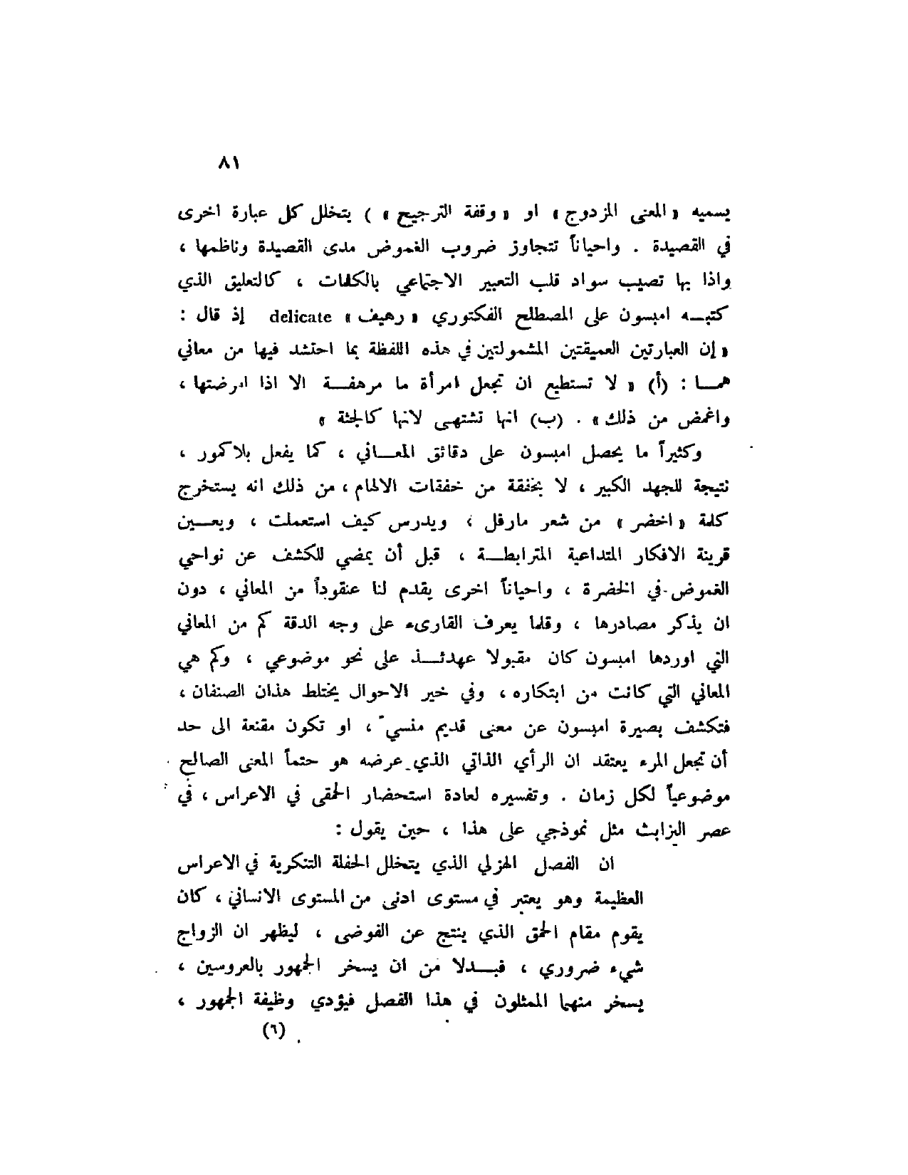 يسميه " المعنى المزدوج " أو " وقفة الترجيح ") يتخلل كل عبارة أخرى في القصيدة. وأحياناً تتجاوز ضروب الغموض مدى القصيدة وناظمها، وإذا بها تصيب سواد قلب التعبير الاجتماعي بالكلمات، كالتعليق الذي كتبه إمبسون على المصطلح الفكتوري " رهيف " delicate إذ قال: " إن العبارتين العميقتين المشمولتين في هذه اللفظة بما احتشد فيها من معاني هما: (أ) " لا تستطيع أن تجعل امرأة ما مرهفة إلا إذا أمرضتها، وأغمض من ذلك ". (ب) إنها تشتهي لأنها كالجثة ".