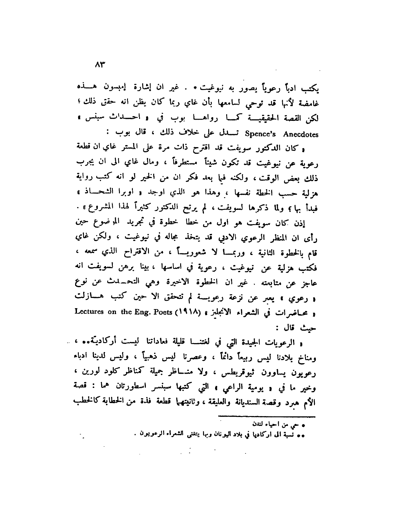 " الرعويات الجيدة التي في لغتنا قليلة فعاداتنا ليست أركادية (2) ، ومناخ بلادنا ليس ربيعاً، وعصرنا ليس ذهبياً، وليس لدينا أدباء رعويون يساوون ثيوقريطس، ولا مناظر جميلة كمناظر كلود لورين، وخير ما في " يومية الراعي " التي كتبها سبنسر أسطورتان هما: قصة الأم هبرد وقصة لسنديانة والعليقة، وثانيتهما قطعة فذة من الخطابة كالخطب