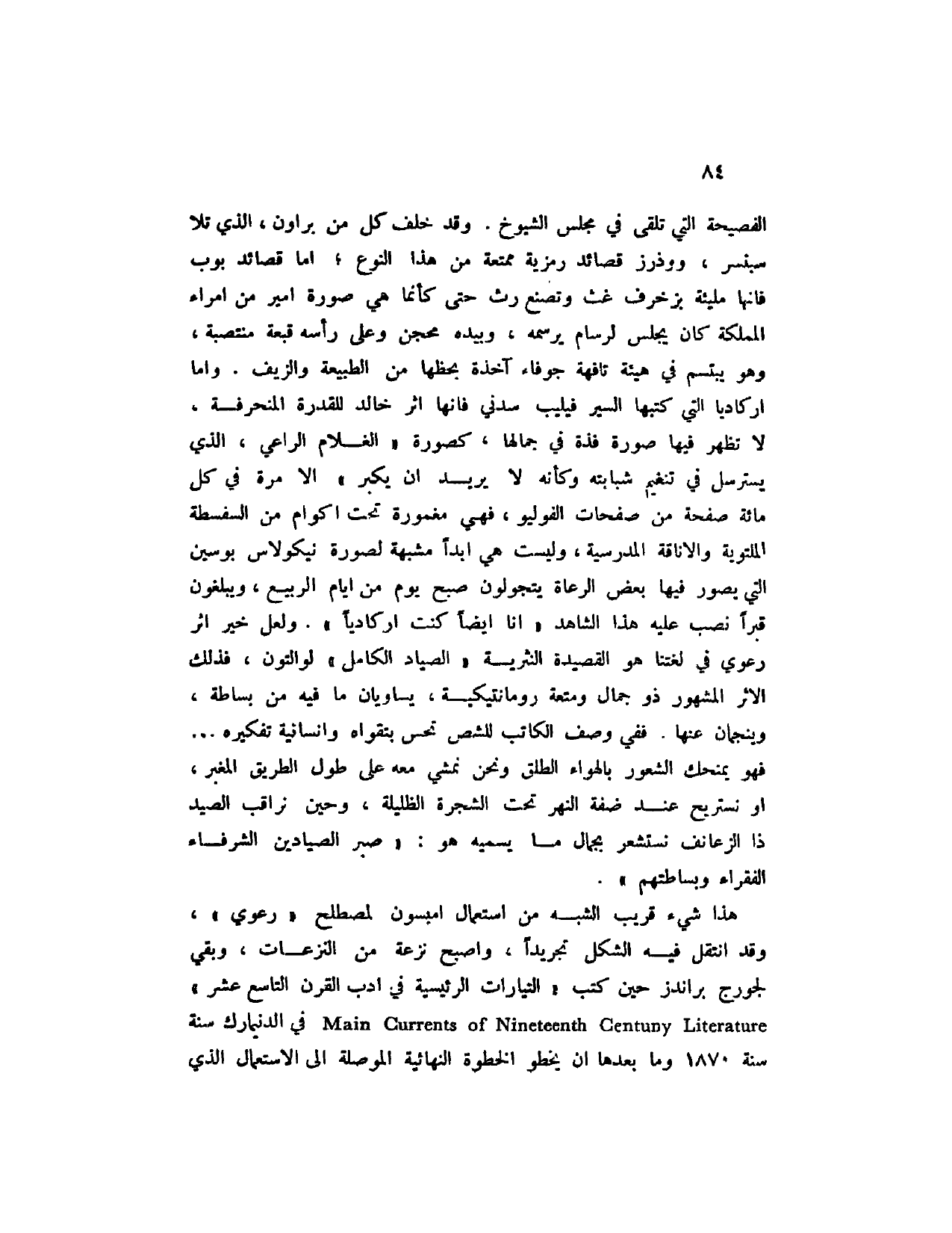الفصيحة التي تلقى في مجلس الشيوخ. وقد خلف كل من براون، الذي تلا سبنسر، ووذرز قصائد رمزية ممتعة من هذا النوع؛ أما قصائد بوب فإنها مليئة بزخرف غث وتصنع رث حتى كأنما هي صورة أمير من أمراء المملكة كان يجلس لرسام يرسمه، وبيده محجن وعلى رأسه قبعة منتصبة، وهو يبتسم في هيئة تافهة جوفاء آخذة بحظها من الطبيعة والزيف. وأما اركاديا التي كتبها السير فيليب سدني فإنها اثر خالد للقدرة المنحرفة، لا تظهر فيها صورة فذة في جمالها، كصورة " الغلام الراعي، الذي يسترسل في تنغيم شبابته وكأنه لا يريد ان يكبر " غلا مرة في كل مائة صفحة من صفحات الفوليو، فهي مغمورة تحت أكوام من السفسطة الملتوية والأناقة المدرسية، وليست هي أبداً مشبهة لصورة نيكولاس بوسين التي يصور فيها بعض الرعاة يتجولون صبح يوم من أيام الربيع، ويبلغون قبراً نصب عليه هذا الشاهد " أنا أيضاً كنت اركادياً ". ولعل خير اثر رعوي في لغتنا هو القصيدة النثرية " الصياد الكامل " لوالتون، فذلك الأثر المشهور ذو جمال ومتعة رومانتيكية، يساويان ما فيه من بساطة، وينجمان عنها. ففي وصف الكاتب للشص تحس بتقواه وإنسانية تفكيره؟ فهو يمنحك الشعور بالهواء الطلق ونحن نمشي معه على طول الطريق المغبر، أو نستريح عند ضفة النهر تحت الشجرة الظليلة، وحين نراقب الصيد ذا الزعانف نستشعر بجمال ما يسميه هو: " صبر الصيادين الشرفاء الفقراء وبساطتهم ".