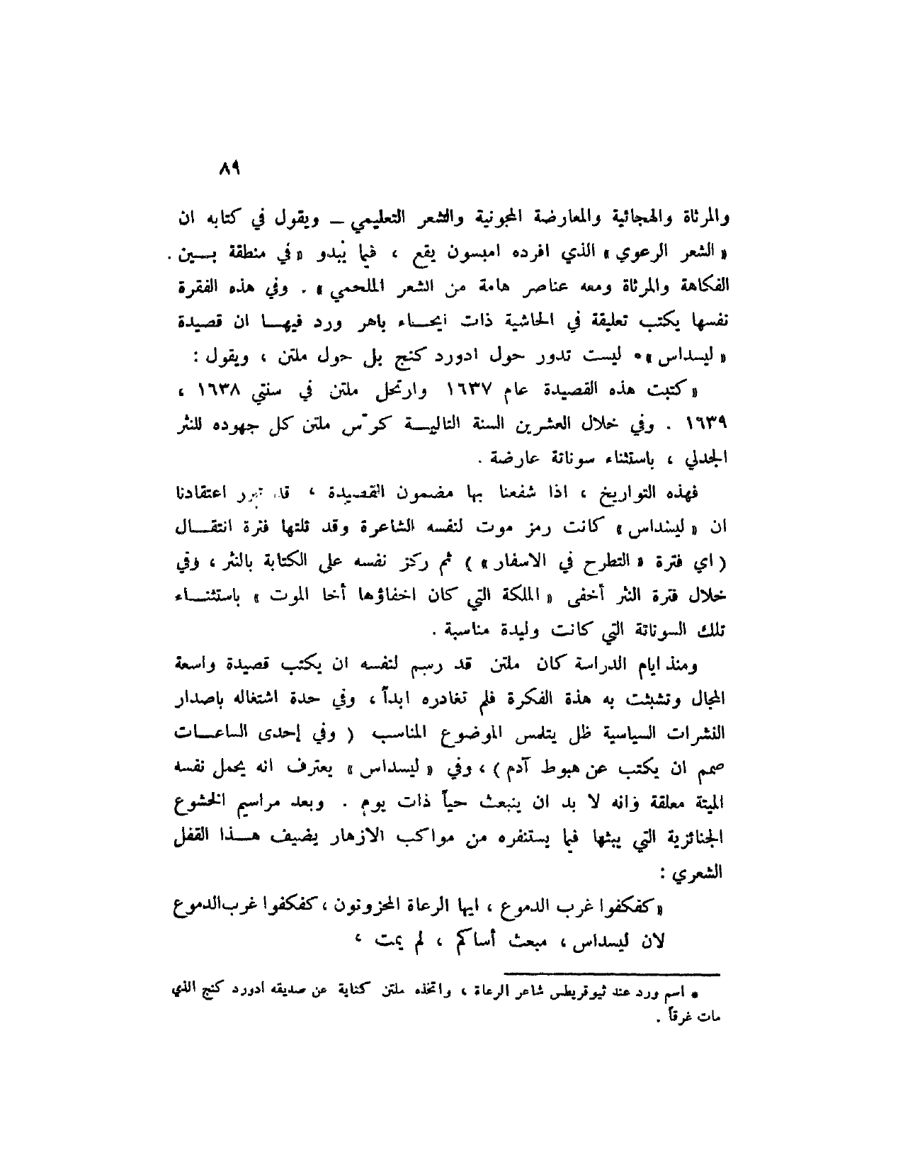 والمرثاة والهجائية والمعارضة المجونية والشعر التعليمي - ويقول في كتابه أن " الشعر الرعوي " الذي أفرده إمبسون يقع، فيما يبدو " في منطقة بين الفكاهة والمرثاة ومعه عناصر هامة من الشعر الملحمي ". وفي هذه الفقرة نفسها يكتب تعليقة في الحاشية ذات إيحاء باهر ورد فيها إن قصيدة " ليسداس " (1) ليست تدور حول أدورد كنج بل حول ملتن، في سنتي 1638، 1639. وفي خلال العشرين السنة التالية كرس ملتن كل جهوده للنثر الجدلي، باستثناء سوناتة عارضة.