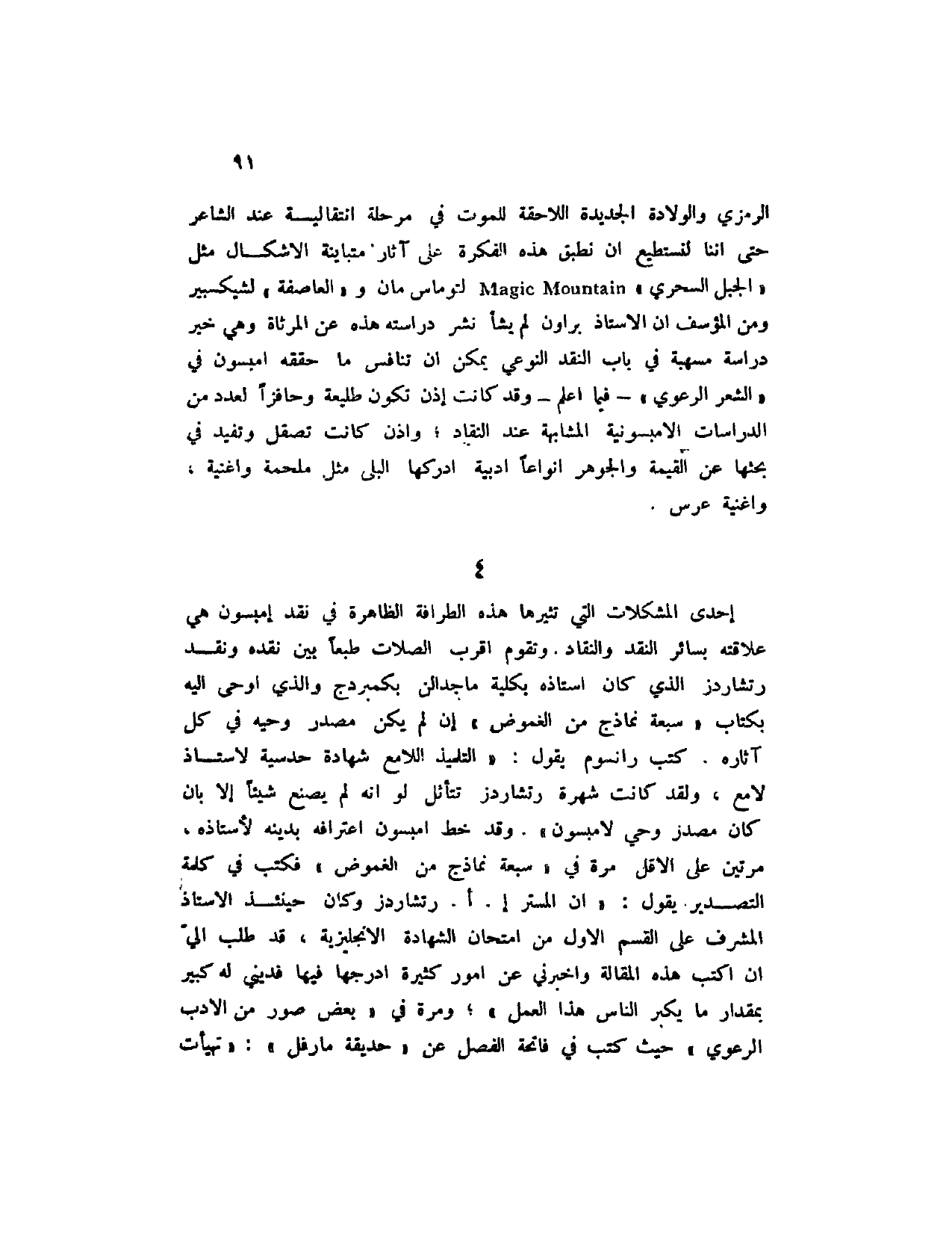 الرمزي والولادة الجديدة اللاحقة للموت في مرحلة انتقالية عند الشاعر حتى أننا لنستطيع أن نطبق هذه الفكرة على آثار متباينة الأشكال مثل " الجبل السحري " Magic Mountain لتوماس مان و " العاصفة " لشيكسبير ومن المؤسف أن الأستاذ براون لم يشأ نشر دراسته هذه عن المرثاة وهي خير دراسة مسهبة في باب النقد النوعي يمكن أن تنافس ما حققه إمبسون في " الشعر الرعوي " - فيما أعلم - وقد كانت أذن تكون طليعة وحافزاً لعدد من الدراسات الإمبسونية المشابهة عند النقاد؛ وإذن كانت تصقل وتفيد في بحثها عن القيمة والجوهر أنواعاً أدبياً أدركها البلى مثل ملحمة وأغنية، وأغنية عرس.