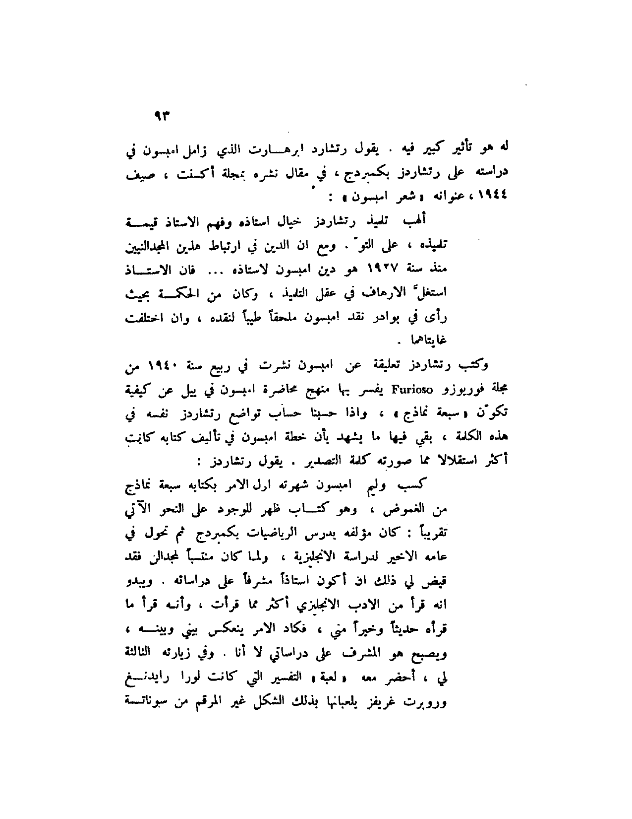 ألهب تلميذ رتشاردز خيال أستاذه وفهم الأستاذ قيمة تلميذه، على التو. ومع أن الدين في ارتباط هذين المجدالنيين منذ سنة 1927 هو دين إمبسون لأستاذه؟ فإن الأستاذ استغل الإرهاف في عقل التلميذ، وكان من الحكمة بحيث رأى في بوادر نقد إمبسون ملحقاً طيباً لنقده، وأن اختلفت غايتاهما.