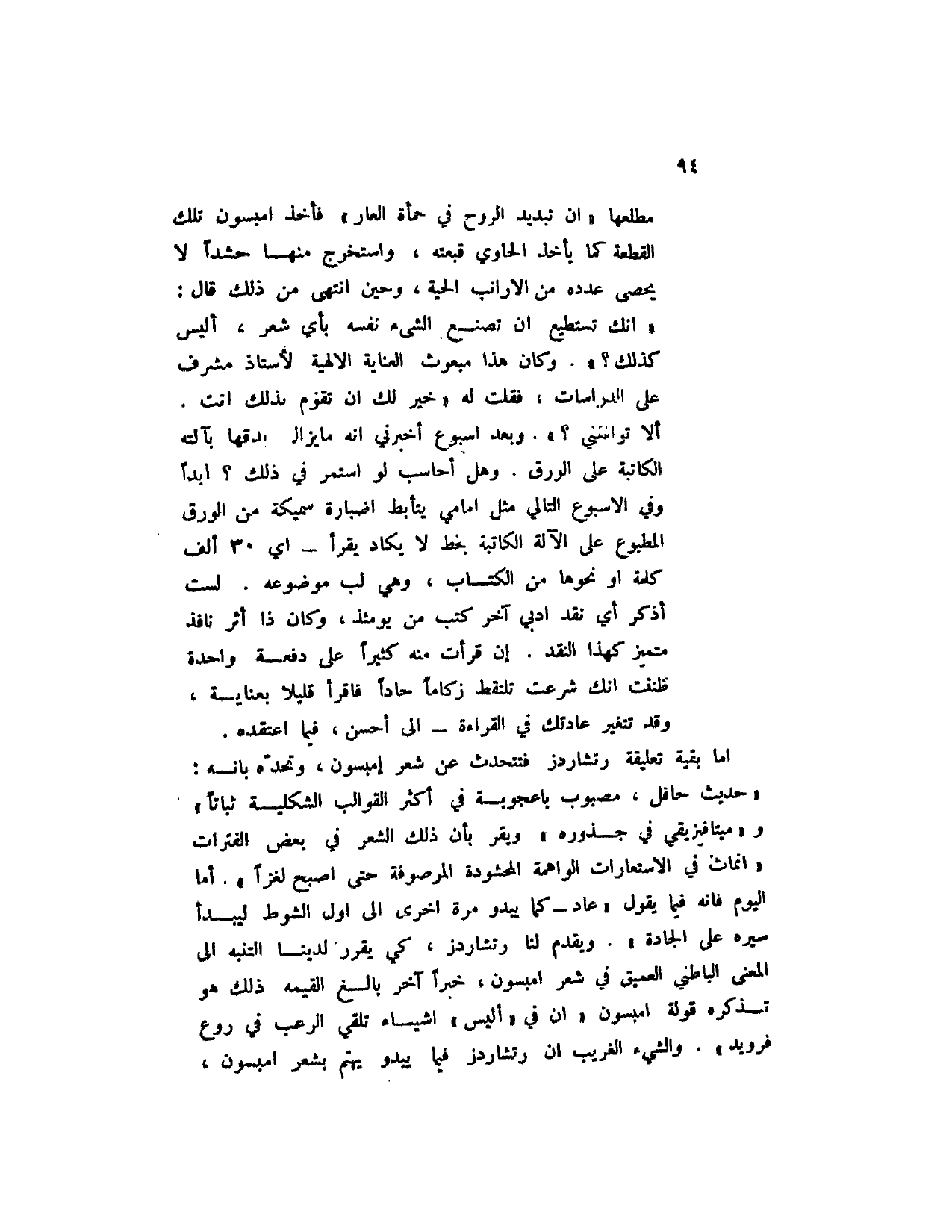 مطلعها " ان تبديد الروح في حماة العار " فاخذ إمبسون تلك القطعة كما يأخذ الحاوي قبعته، واستخرج منها حشداً لا يحصى عدده من الأرانب الحية، وحين انتهى من ذلك قال: " إنك تستطيع ان تصنع الشيء نفسه بأي شعر، أليس كذلك؟ ". وكان هذا مبعوث العناية الإلهية لأستاذ مشرف على الدراسات، فقلت له " خير لك ان تقوم بذلك أنت. الكاتبة على الورق. وهل أحاسب لو استمر في ذلك؟ أبداً وفي الأسبوع التالي مثل أمامي يتأبط إضبارة سميكة من الورق المطبوع على الآلة الكاتبة بخط لا يكاد يقرأ - أي 30 ألف كلمة أو نحوها من الكتاب، وهي لب موضوعه. لست أذكر أي نقد أدبي آخر كتب من يومئذ، وكان ذا أثر نافذ متميز كهذا النقد. عن قرأت منه كثيراً على دفعة واحدة ظننت انك شرعت تلتقط زكاماً حاداً فاقرأ قليلا بعناية، وقد تتغير عادتك في القراءة - إلى احسن، فيما اعتقده.