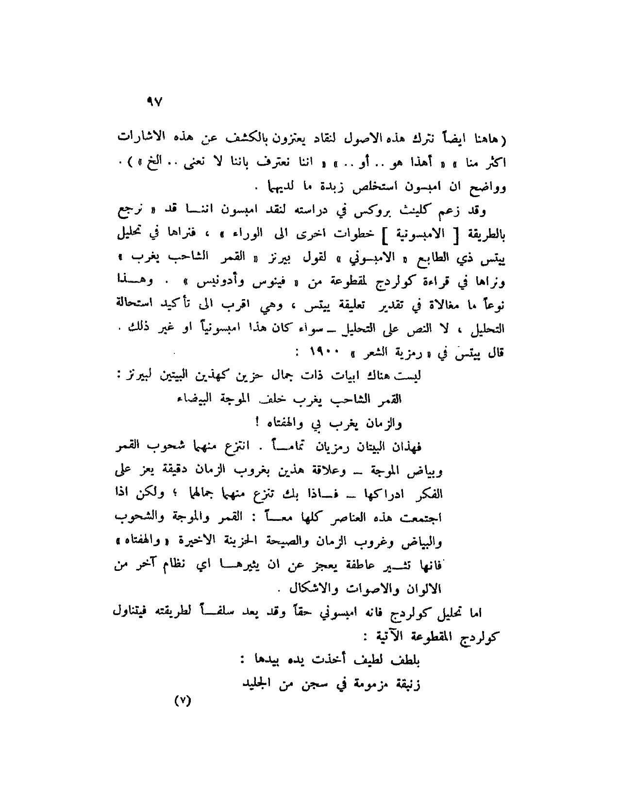 (هاهنا أيضاً نترك هذه الأصول لنقاد يعتزون بالكشف عن هذه الإشارات أكثر منا " " أهذا هو؟ أو.. " " أننا نعترف بأننا لا نعني.. الخ ") . وواضح ان إمبسون استخلص زبدة ما لديهما.