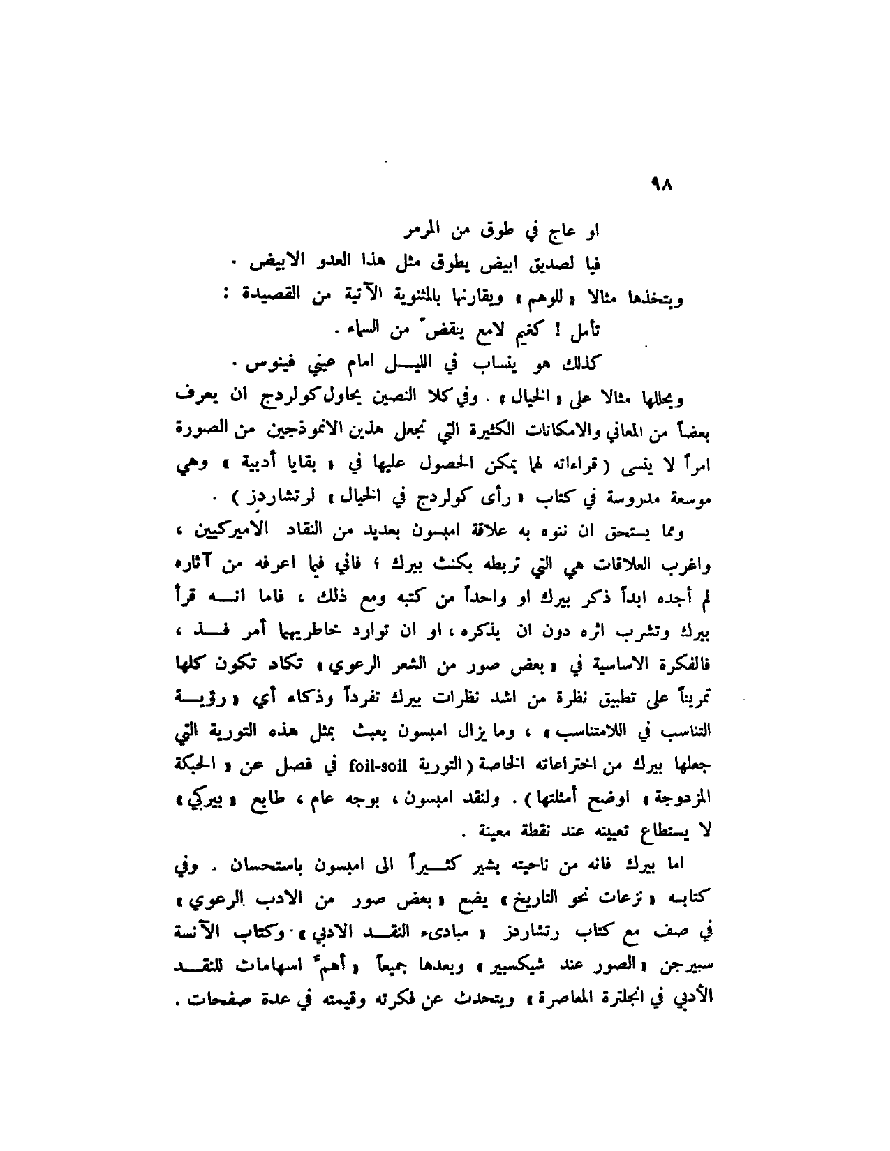 ومما يستحق أن ننوه به علاقة إمبسون بعديد من النقاد الأميركيين، وأغرب العلاقات هي التي تربطه بكنث بيرك؛ فإني فيما أعرفه من آثاره لم أجده أبداً ذكر بيرك أو واحداً من كتبه ومع ذلك، فأما أنه قرأ بيرك وتشرب أثره دون أن يذكره، أو أن توارد خاطريهما أمر فذ، فالفكرة الأساسية في " بعض صور من الشعر الرعوي) تكاد تكون كلها تمريناً على تطبيق نظرة من أشد نظرات بيرك تفرداً وذكاء أي " رؤية التناسب في اللامتناسب "، وما يزال إمبسون يعبث بمثل هذه التورية التي جعلها بيرك من اختراعاته الخاصة (التورية foil - soil في فصل عن " الحبكة المزدوجة " أوضح أمثلتها) . ولنقد إمبسون، بوجه عام، طابع " بيركي " لا يستطاع تعيينه عند نقطة معينة.