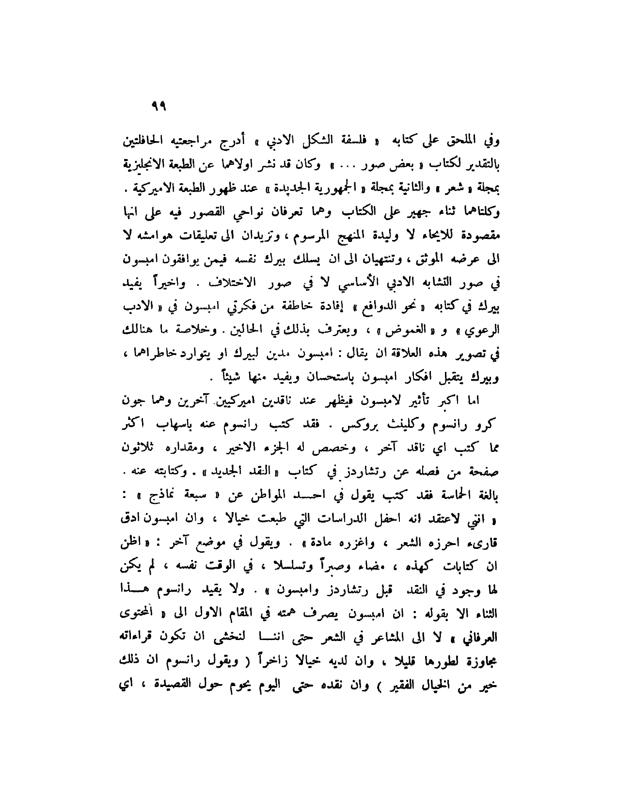وفي الملحق على كتابه " فلسفة الشكل الأدبي " أدرج مراجعتيه الحافلتين بالتقدير لكتاب " بعض صور؟ " وكان قد نشر أولاهما عن الطبعة الإنجليزية بمجلة " شعر " والثانية بمجلة " الجمهورية الجديدة " عند ظهور الطبعة الأميركية. وكلتاهما ثناء جهير على الكتاب وهما تعرفان نواحي القصور فيه على إنها مقصودة للإيحاء لا وليدة المنهج المرسوم، وتزيدان إلى تعليقات هوامشه لا إلى عرضه الموثق، وتنتهيان إلى أن يسلك بيرك نفسه فيمن يوافقون إمبسون في صور التشابه الأدبي الأساسي لا في صور الاختلاف. وأخيراً يفيد بيرك في كتابه " نحو الدوافع " إفادة خاطفة من فكرتي إمبسون في " الأدب الرعوي " و " الغموض "، ويعترف بذلك في الحالين. وخلاصة ما هنالك في تصوير هذه العلاقة ان يقال: غمبسون مدين لبيرك أو يتوارد خاطراهما، وبيرك يتقبل أفكار إمبسون باستحسان ويفيد منها شيئاً.