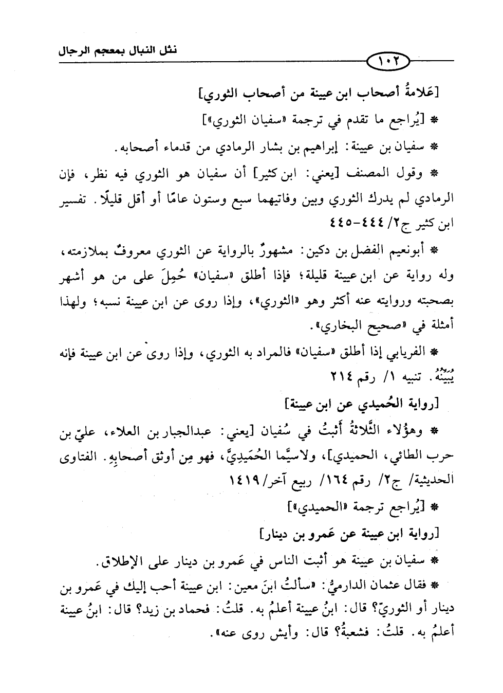 * وهؤُلاء الثَّلاثةُ أَثبتُ في سُفيان [يعني: عبد الجبار بن العلاء، عليّ بن حرب الطائي، الحميدي]، ولا سيَّما الحُمَيدِيَّ، فهو مِن أوثق أصحابِهِ. الفتاوى الحديثية/ ج 2/ رقم 164/ ربيع آخر/ 1419