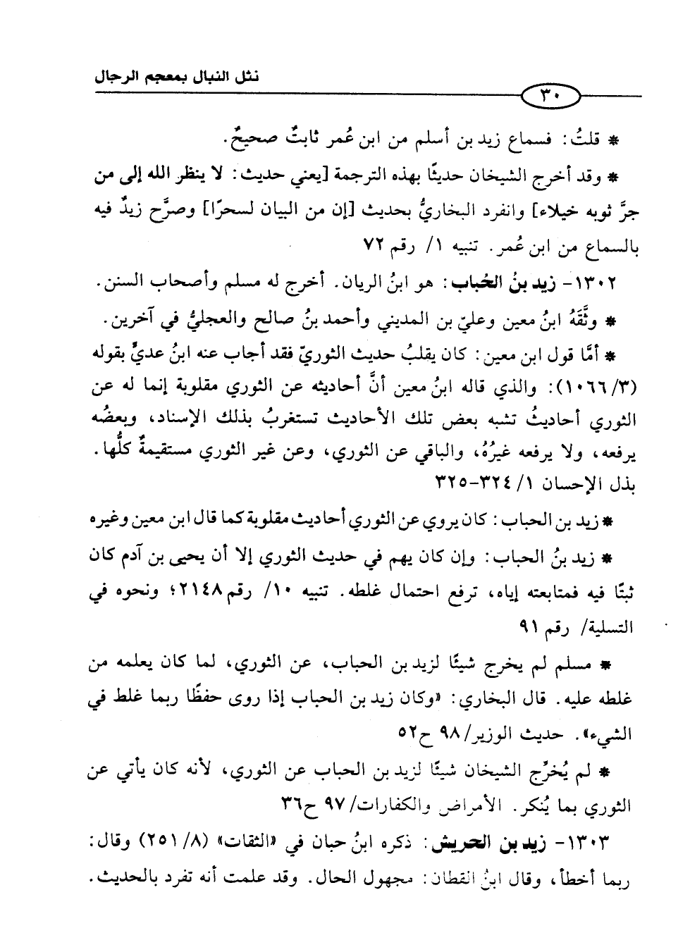 * مسلم لم يخرج شيئًا لزيد بن الحباب، عن الثوري، لما كان يعلمه من غلطه عليه. قال البخاري: "وكان زيد بن الحباب إذا روى حفظًا ربما غلط في الشيء". حديث الوزير/ 98 ح 52