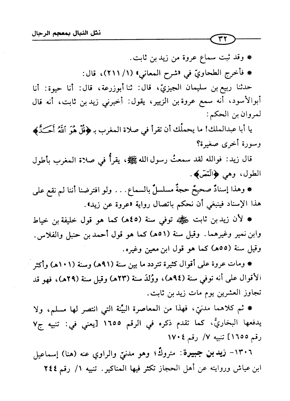 *لأن زيد بن ثابت -رَضِيَ الله عَنْهُ- توفي سنة (45 هـ) كما هو قول خليفة بن خياط وابن نمير وغيرهما. وقيل سنة (51هـ) كما هو قول أحمد بن حنبل والفلاس. وقيل سنة (55 هـ) كما هو قول ابن معين وغيره.