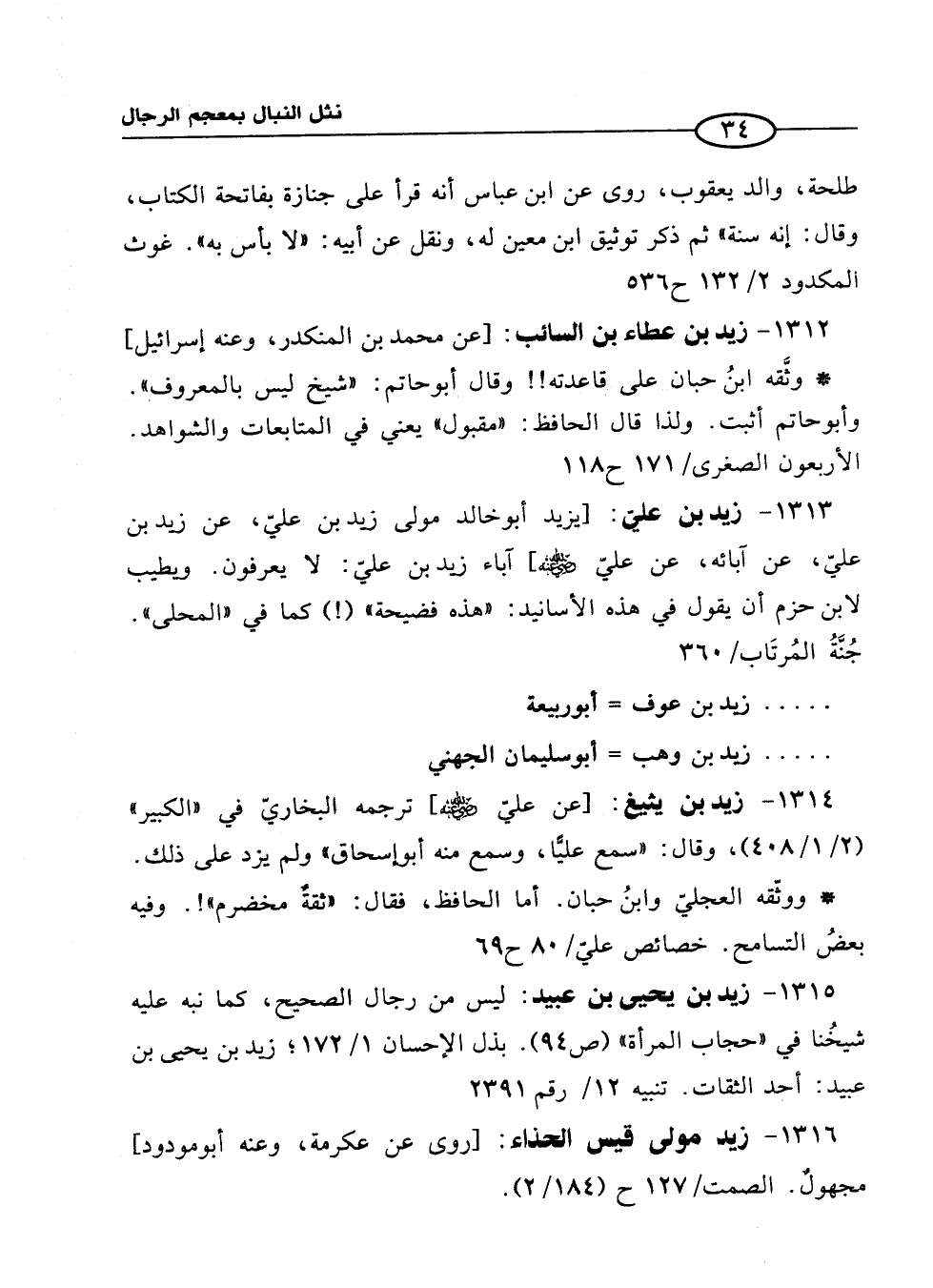 1313 - زيد بن عليّ: [يزيد أبو خالد مولى زيد بن عليّ، عن زيد بن عليّ، عن آبائه عن عليّ -رَضِيَ الله عَنْهُ-] آباء زيد بن عليّ: لا يعرفون. ويطيب لابن حزم أن يقول في هذه الأسانيد: "هذه فضيحة" (!) كما في "المحلى". جُنَّةُ المُرتَاب/ 360
