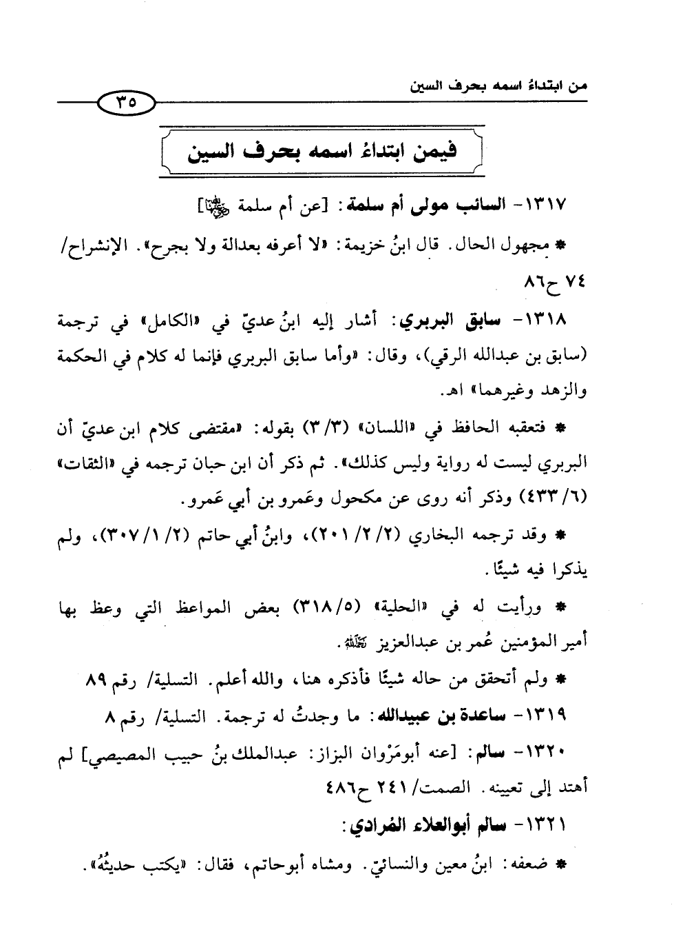 1318 - سابق البربري: أشار إليه ابنُ عديّ في "الكامل" في ترجمة (سابق بن عبد الله الرقي)، وقال: "وأما سابق البربري فإنما له كلام في الحكمة والزهد وغيرهما "اهـ.