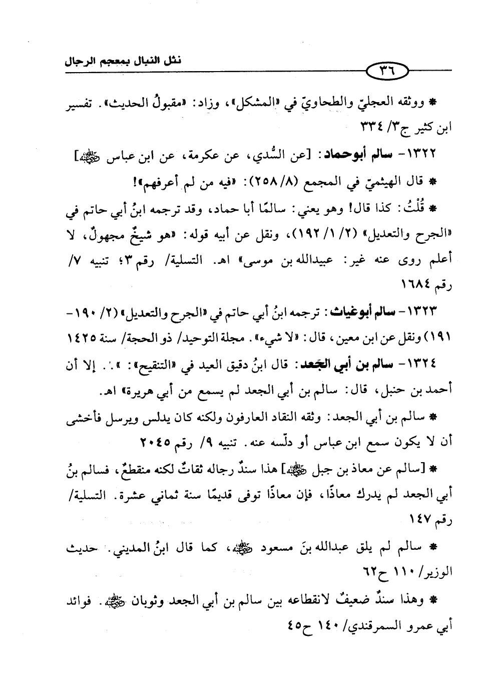 1323 - سالم أبو غياث: ترجمه ابنُ أبي حاتم في "الجرح والتعديل" (2/ 190 - 191) ونقل عن ابن معين، قال: "لا شيء". مجلة التوحيد/ ذو الحجة/ سنة 1425