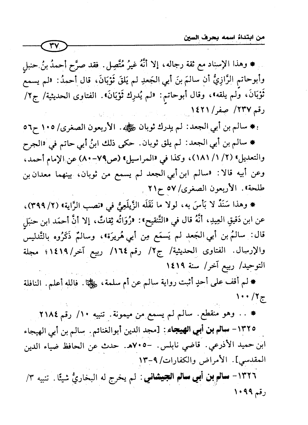 * سالم بن أبي الجعد: لم يدرك ثوبان -رَضِيَ الله عَنْهُ-. الأربعون الصغرى/ 105 ح 56