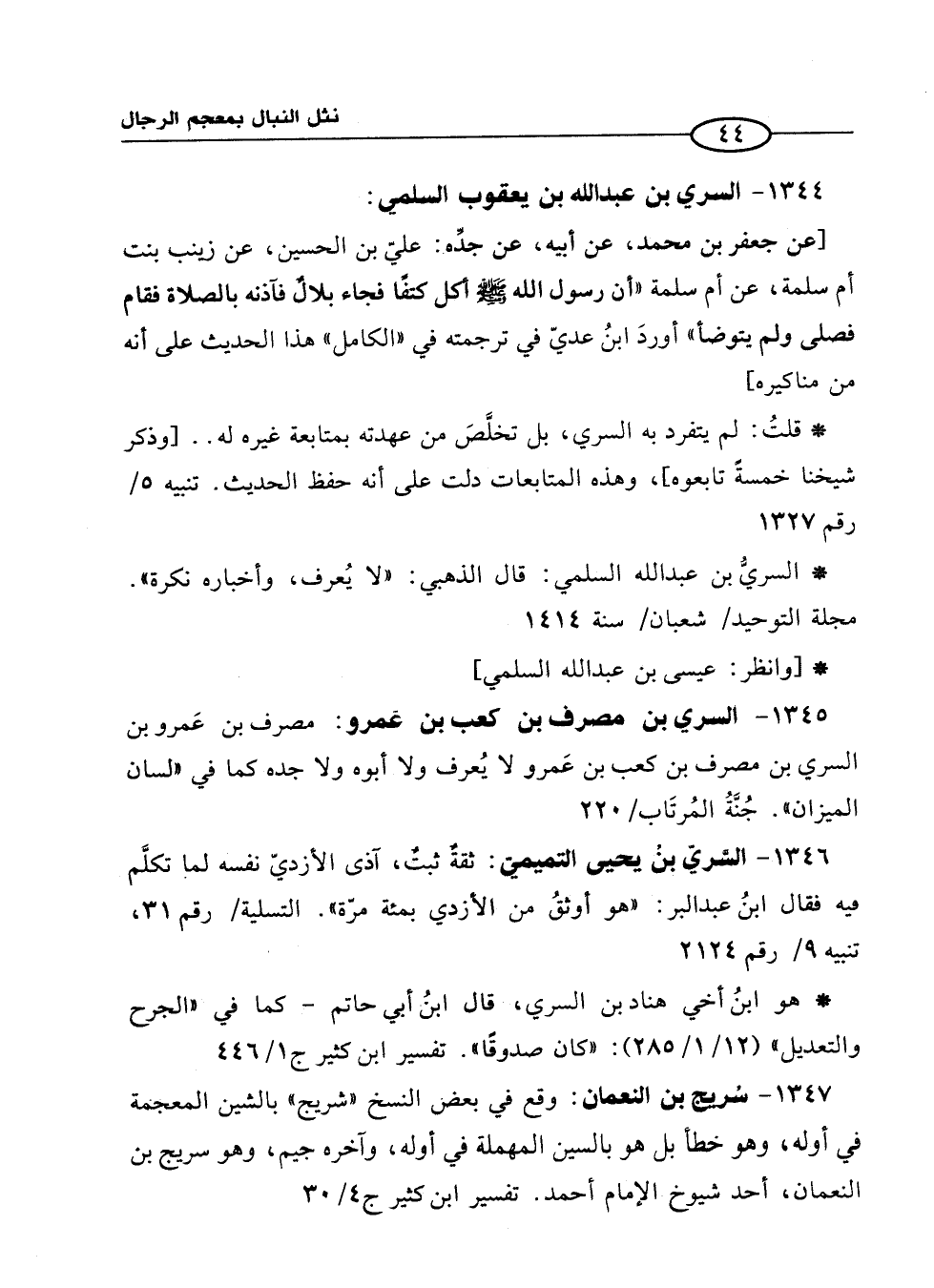 1345 - السري بن مصرف بن كعب بن عَمرو: مصرف بن عَمرو بن السري بن مصرف بن كعب بن عَمرو لا يُعرف ولا أبوه ولا جده كما في "لسان الميزان". جُنَّةُ المُرتَاب/ 220