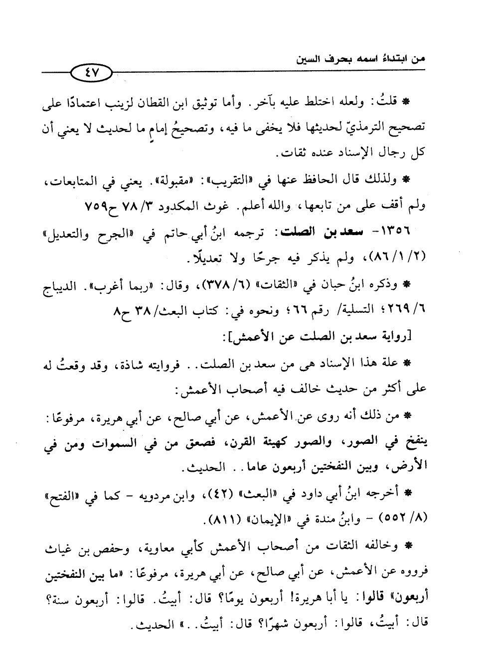 * وخالفه الثقات من أصحاب الأعمش كأبي معاوية، وحفص بن غياث فرووه عن الأعمش، عن أبي صالح، عن أبي هريرة، مرفوعًا: "ما بين النفختين أربعون" قالوا. يا أبا هريرة! أربعون يومًا؟ قال: أبيتُ. قالوا: أربعون سنة؟ قال: أبيتُ، قالوا: أربعون شهرًا؟ قال: أبيتُ. . " الحديث.