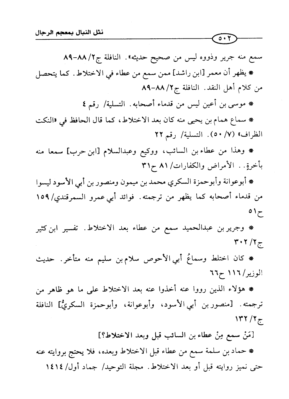 * حماد بن سلمة سمع من عطاء قبل الاختلاط وبعده، فلا يحتج بروايته عنه حتى تميز روايته قبل أو بعد الاختلاط. مجلة التوحيد / جماد أول/ 1414