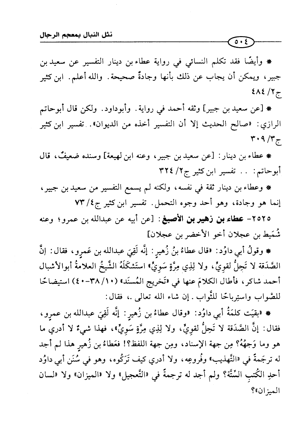 * وأيضًا فقد تكلم النسائي في رواية عطاء بن دينار التفسير عن سعيد بن جبير، ويمكن أن يجاب عن ذلك بأنها وجادةٌ صحيحة. والله أعلم. ابن كثير ج2/ 484