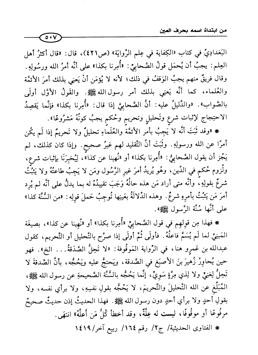 البَغدادِيِّ في كتاب "الكِفاية في عِلم الرِّوايَة" (ص 421)، قال: "قال أكثرُ أهل العِلم: يجبُ أن يُحمَل قولُ الصَّحابِيِّ: "أُمِرنا بكذا" على أنَّه أمر الله ورسُولِهِ. وقال فريقٌ منهم يجبُ الوَقفُ في ذلك؛ لأنه لا يُؤمَن أنْ يَعني بذلك أمرَ الأئمَّة والعُلماء، كما أنَّه يَعنِي بذلك أمر رسول الله -صلى الله عليه وسلم-. والقَولُ الأوَّل أولَى بالصواب". "والدَّليلُ عليه: أنَّ الصَّحابِيَّ إذا قال: "أُمِرنا بكذا" فإنَّما يَقصِدُ الاحتِجاج لإثبات شرعٍ وتَحليلٍ وتحريمٍ وحُكمٍ يجبُ كونُهُ مَشرُوعًا".