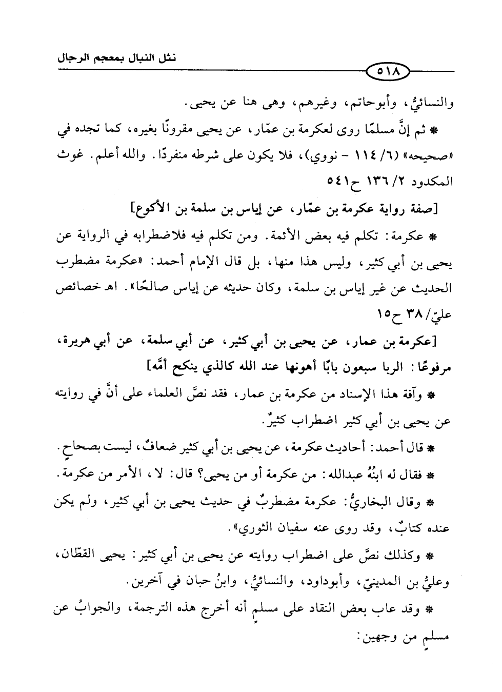 * ثم إنَّ مسلمًا روى لعكرمة بن عمّار، عن يحيى مقرونًا بغيره، كما تجده في "صحيحه" (6/ 114 - نووي)، فلا يكون على شرطه منفردًا. والله أعلم. غوث المكدود 2/ 136 ح541